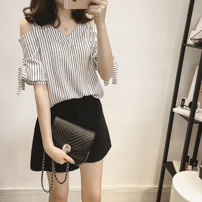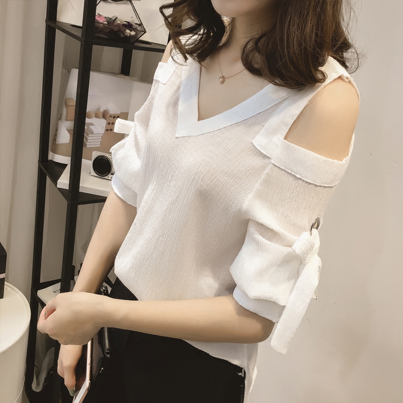 / 夏天衣服性感露肩t恤女短袖韓版大碼寬松打底衫上衣女時尚雪紡衫