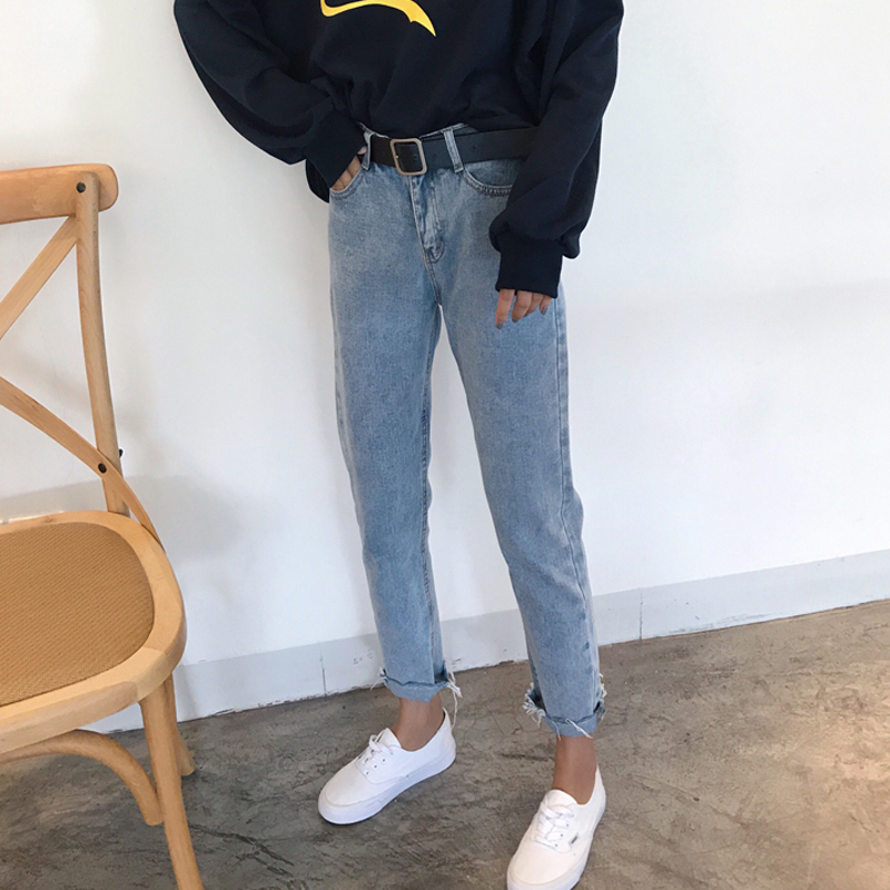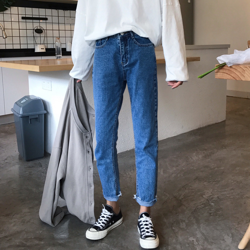 秋裝女裝韓版寬松百搭直筒褲高腰毛邊牛仔褲九分褲學生小腳褲長褲