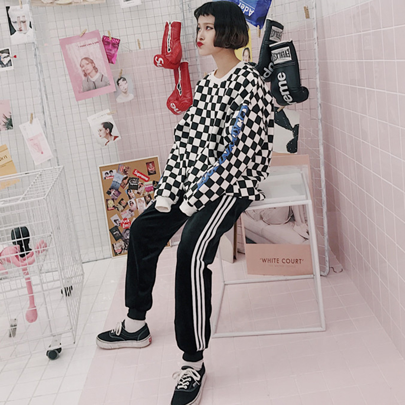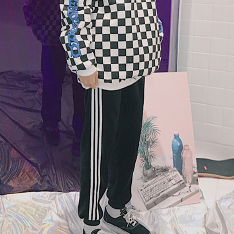 / 學生高腰顯瘦加絨初戀休閑褲子女秋冬裝新款條紋寬松時尚運動長褲
