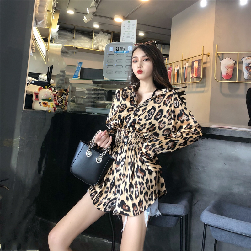 港味簡約時尚氣質百搭復古chic豹紋秋季新款韓版收腰中長款襯衣女