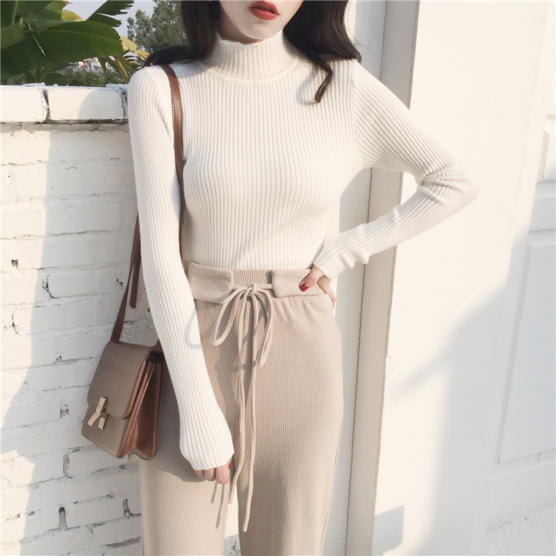 / 港味復古風修身顯瘦百搭半高領純色長袖針織打底衫chic早秋上衣女