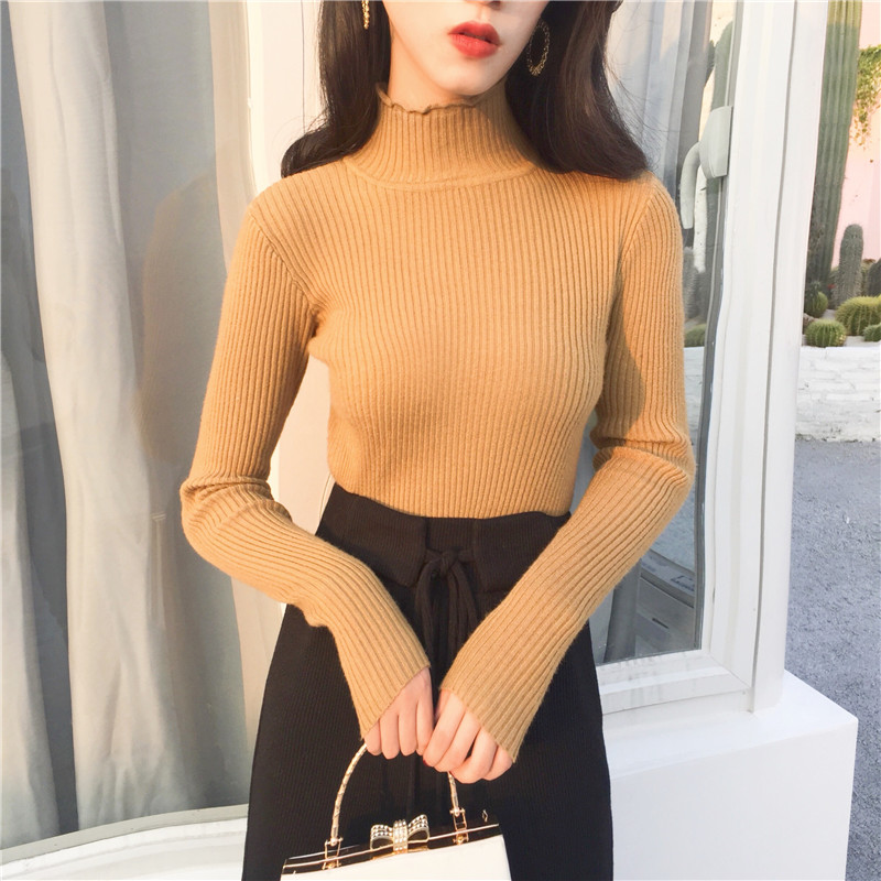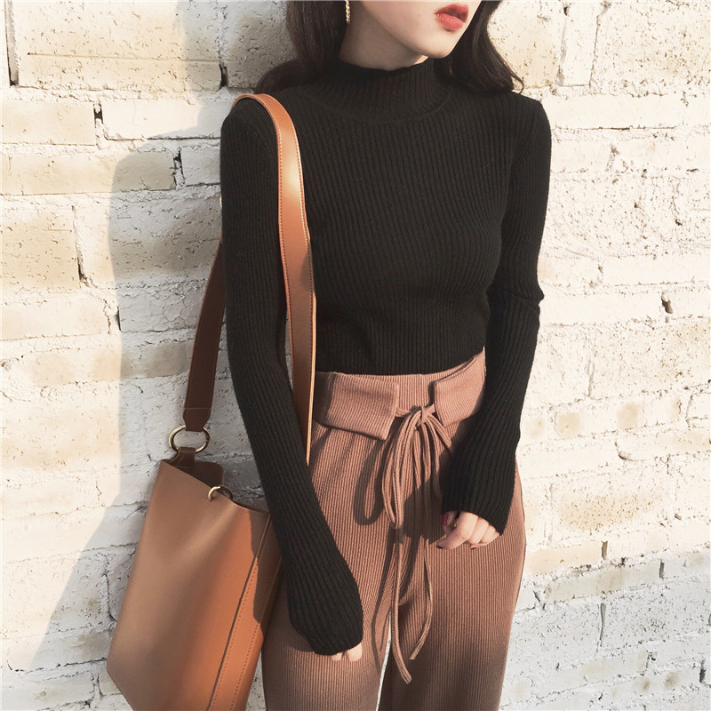 港味復古風修身顯瘦百搭半高領純色長袖針織打底衫chic早秋上衣女