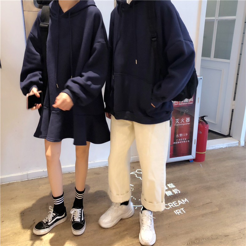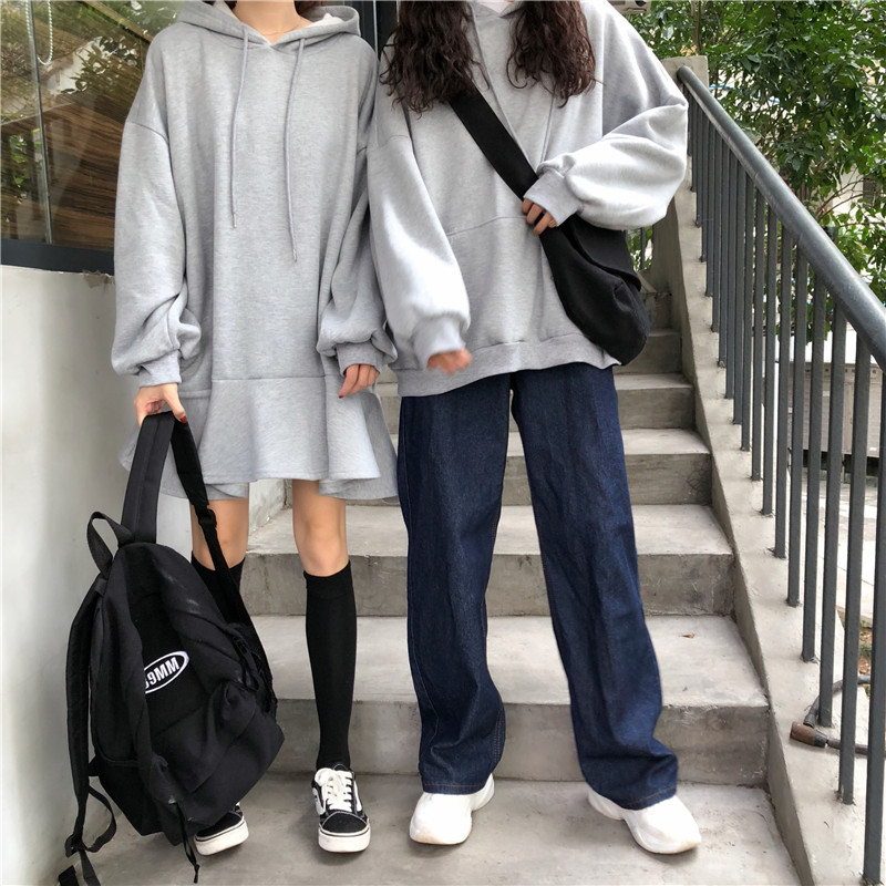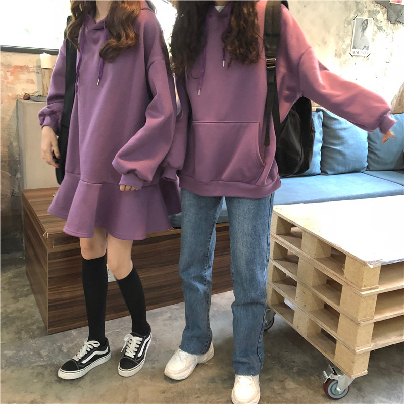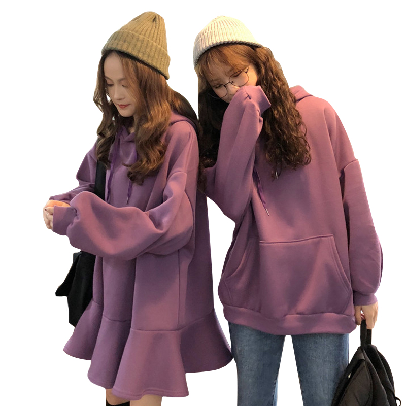 / 秋冬韓版中長款閨蜜寬松連帽套頭加厚加絨荷葉邊衛衣連衣裙外套女