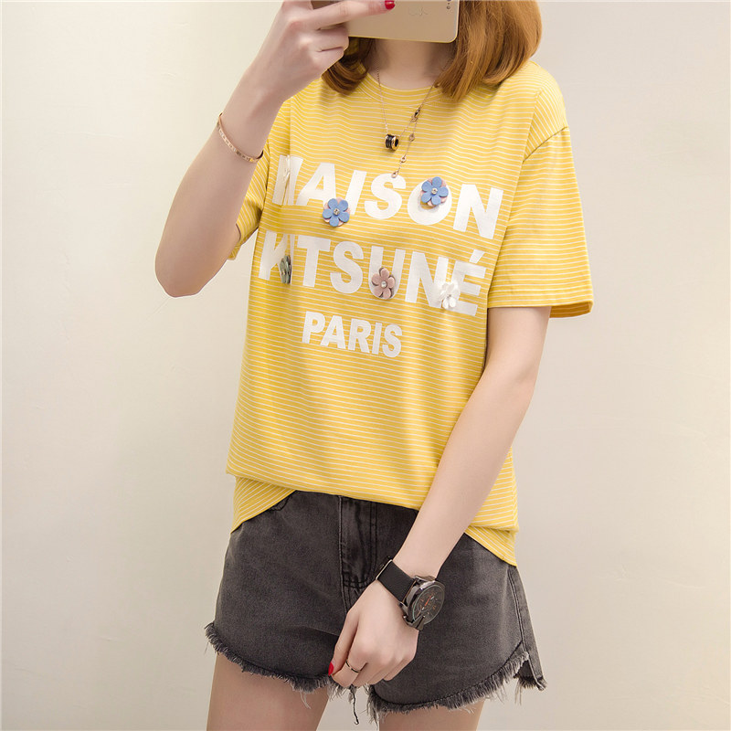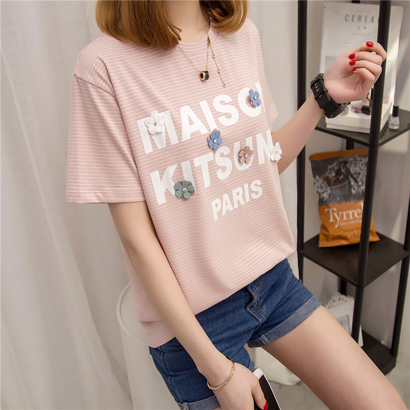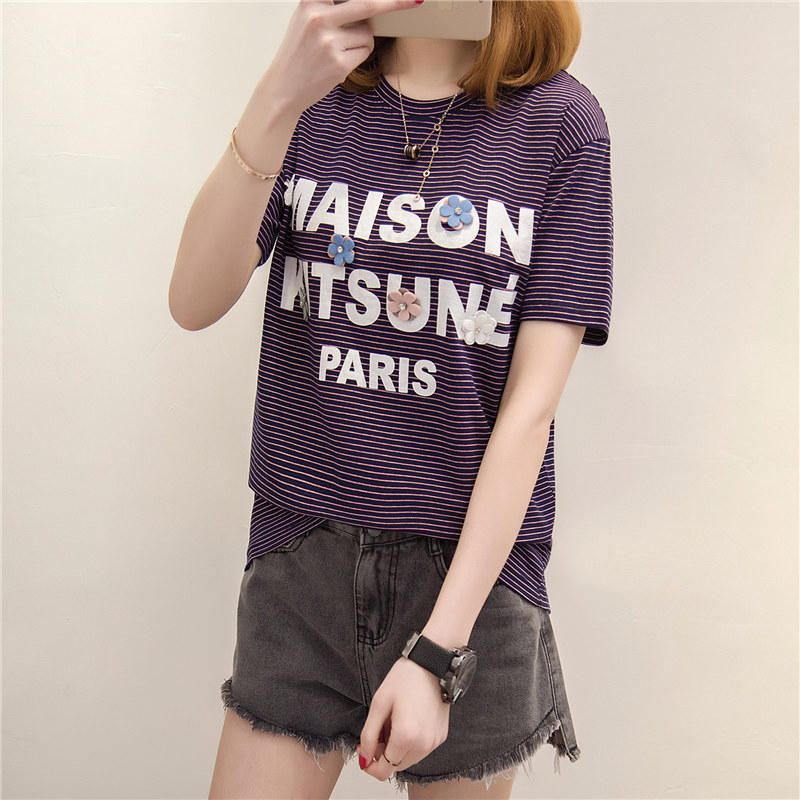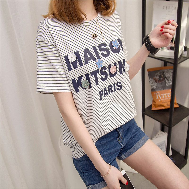 / 條紋t恤女上衣女夏裝新款女裝寬松體恤短袖女韓版百搭小衫潮