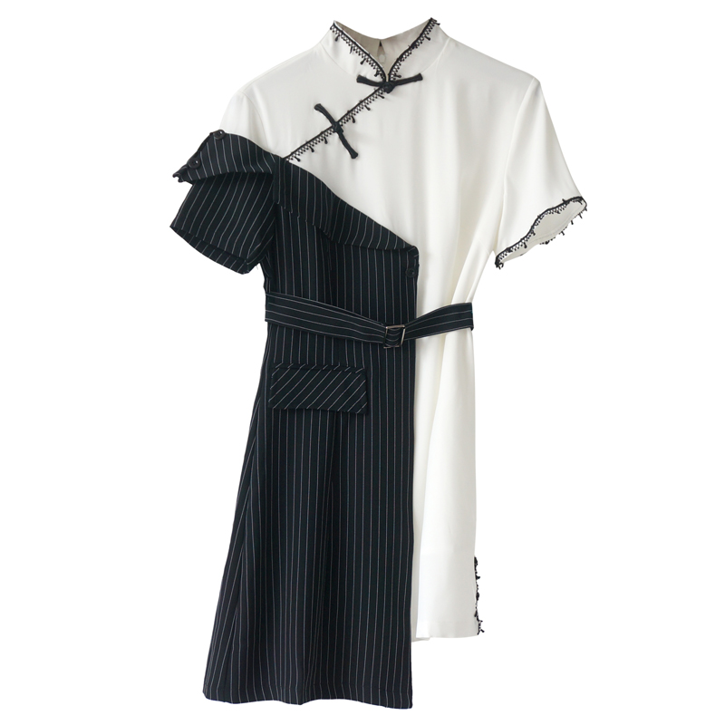 / 夏季復古中國風改良旗袍拼接條紋不規則清新少女連衣裙修身裙子