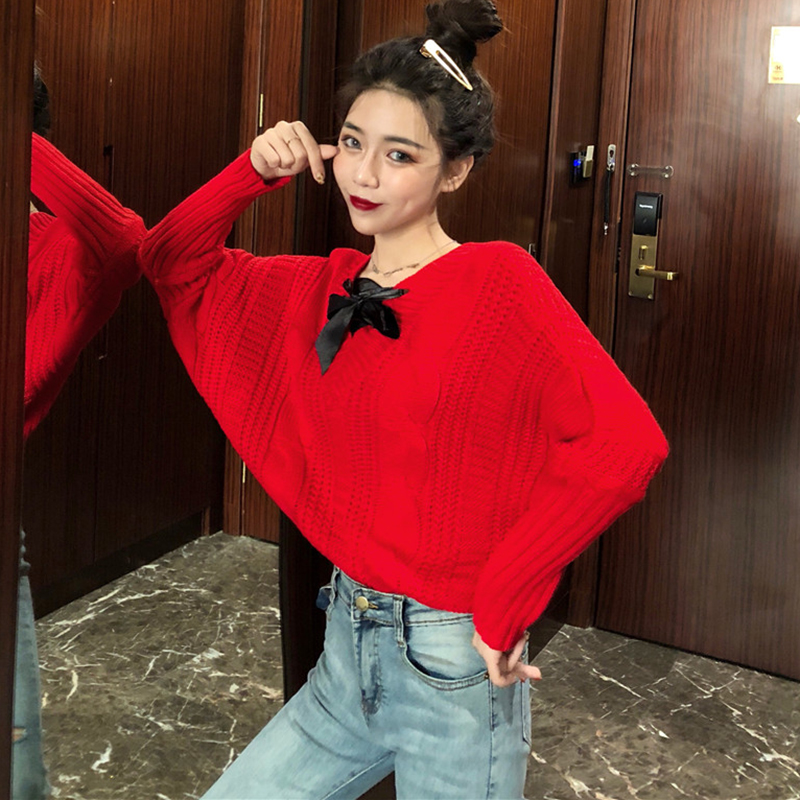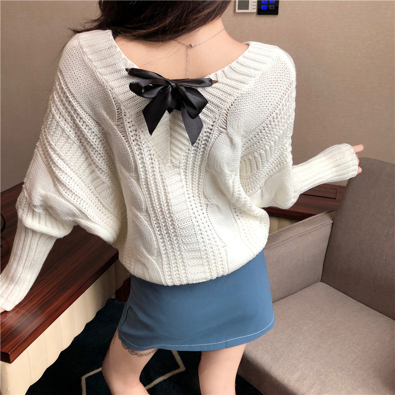 chic前后兩穿綁帶蝴蝶結套頭毛衣女秋冬裝新款寬松蝙蝠長袖針織衫