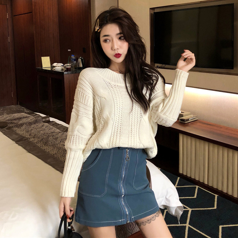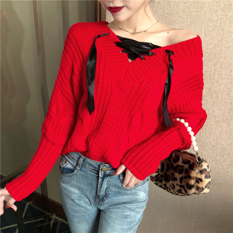 / chic前后兩穿綁帶蝴蝶結套頭毛衣女秋冬裝新款寬松蝙蝠長袖針織衫