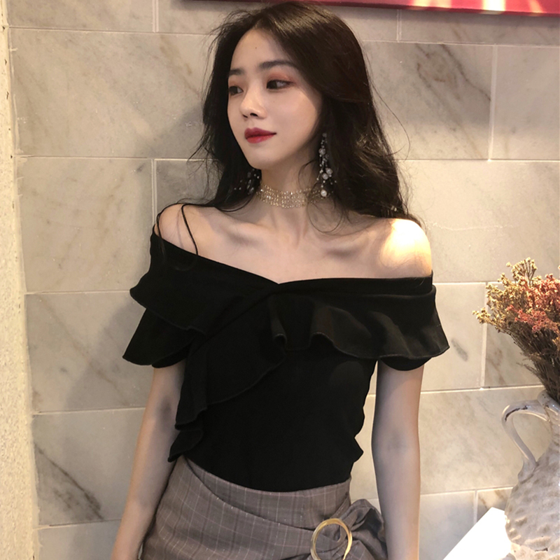 T恤女夏季2018新款韓版一字露肩花邊短款背心荷葉袖修身顯瘦上衣