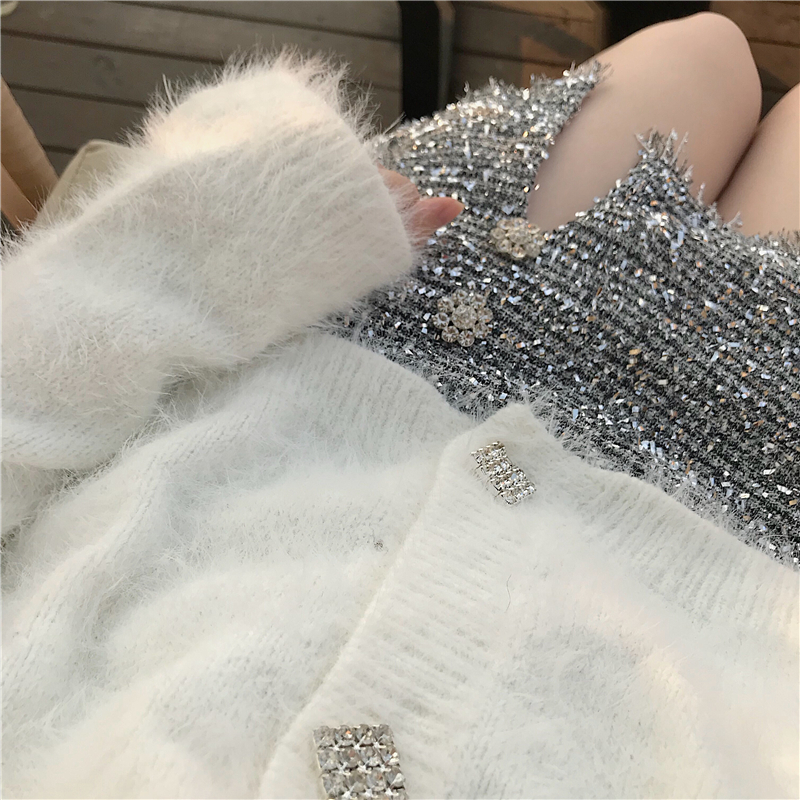 馬海毛網紅毛衣女2018新款針織開衫外套冷淡風針織吊帶連衣裙套裝