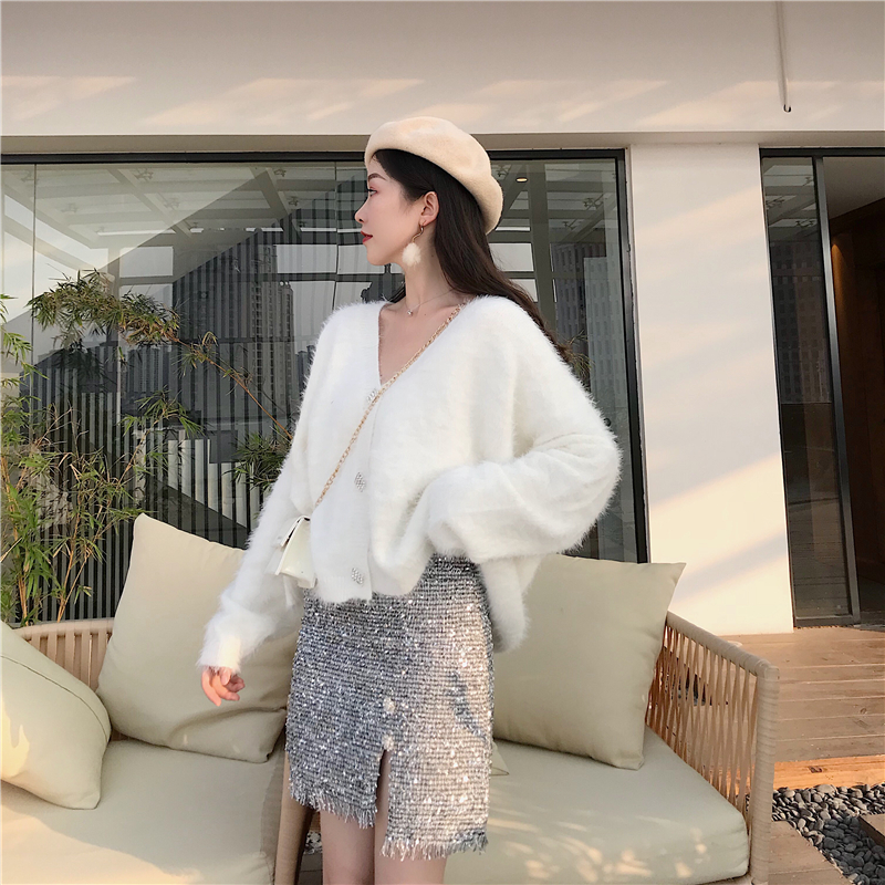 女神套裝秋兩件套慵懶網紅毛衣外套小清新開衫+銀絲高腰半身裙潮