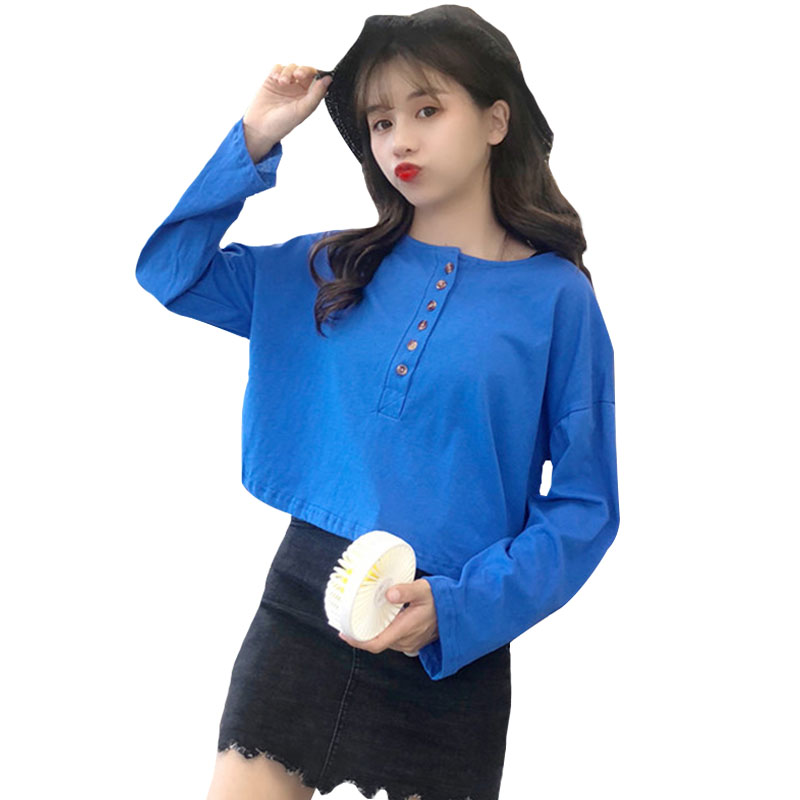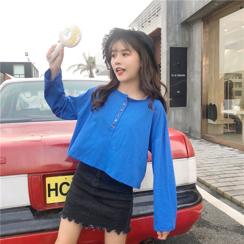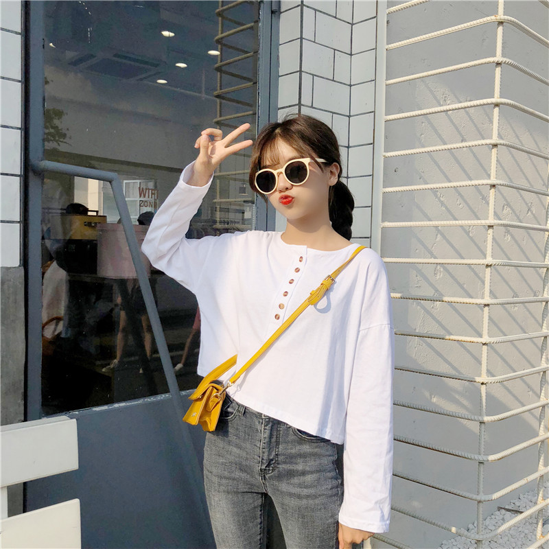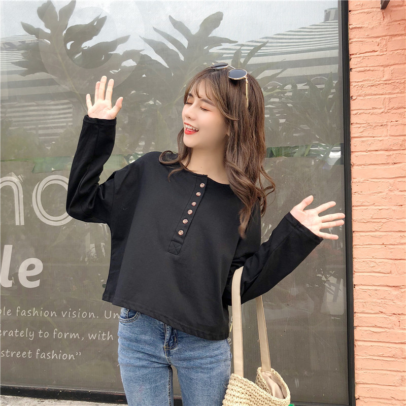 / 秋裝女裝韓版百搭基礎款純色寬松長袖短款T恤單排扣打底衫上衣潮