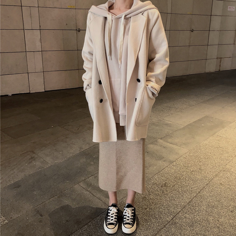 / 女神套裝秋冬新款2018流行呢子大衣寬松長袖衛衣高腰開叉針織裙子