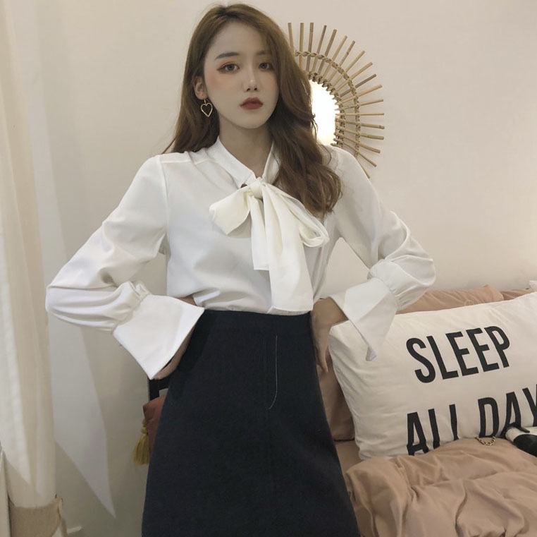 韓版Chic復古風秋裝女2018新款純色顯瘦氣質款喇叭袖領結長袖襯衫