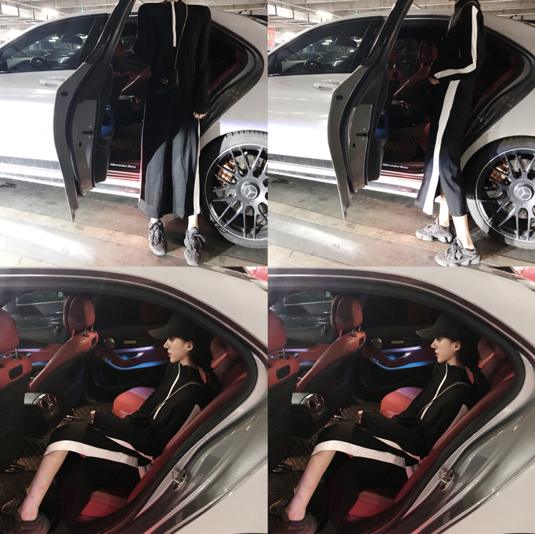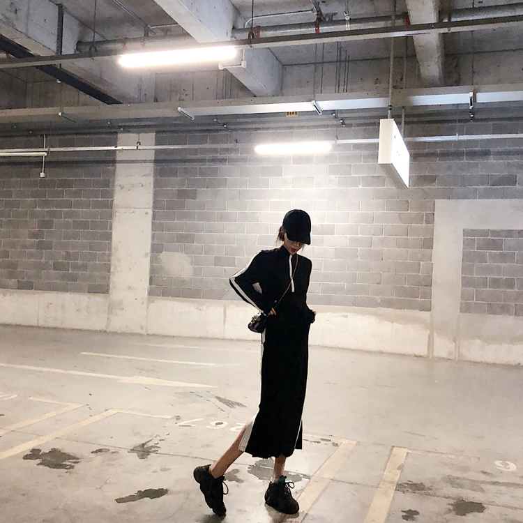 / 港風裙秋新款韓版時尚chic黑白拼色長款休閑裙立領設計款連衣裙女