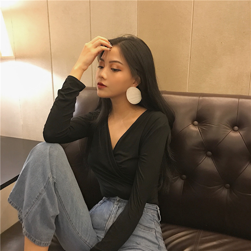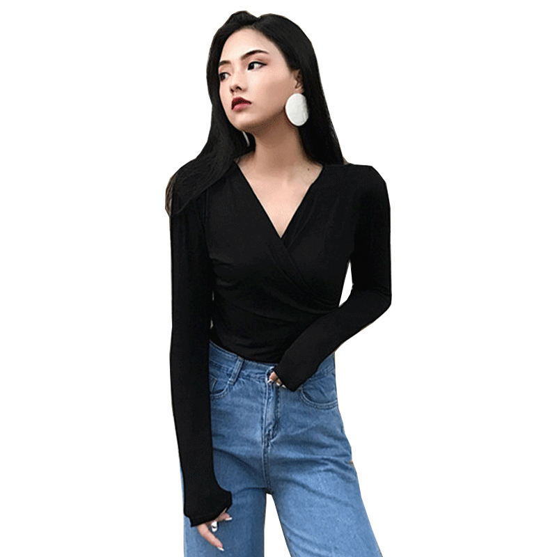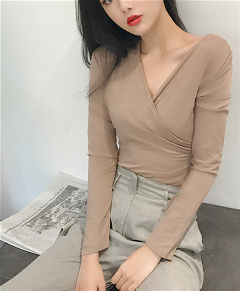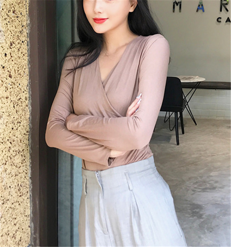 復古chic港味上衣氣質交叉深V領長袖T恤女 春秋裝修身顯瘦打底衫
