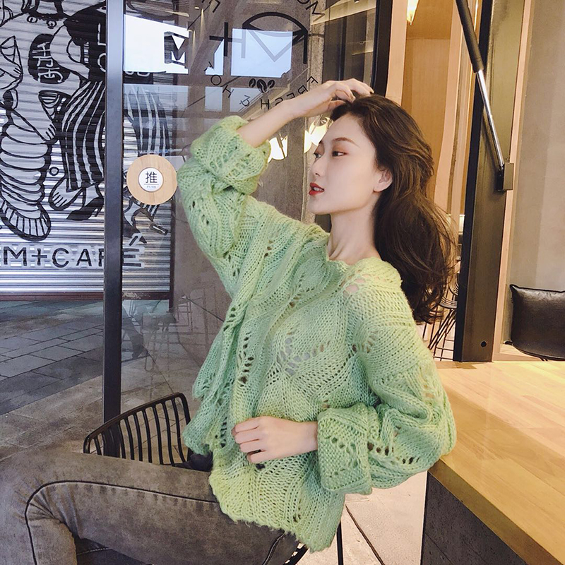 韓版時尚秋裝女2018新款氣質百搭圓領毛衣寬松顯瘦針織衫鏤空上衣