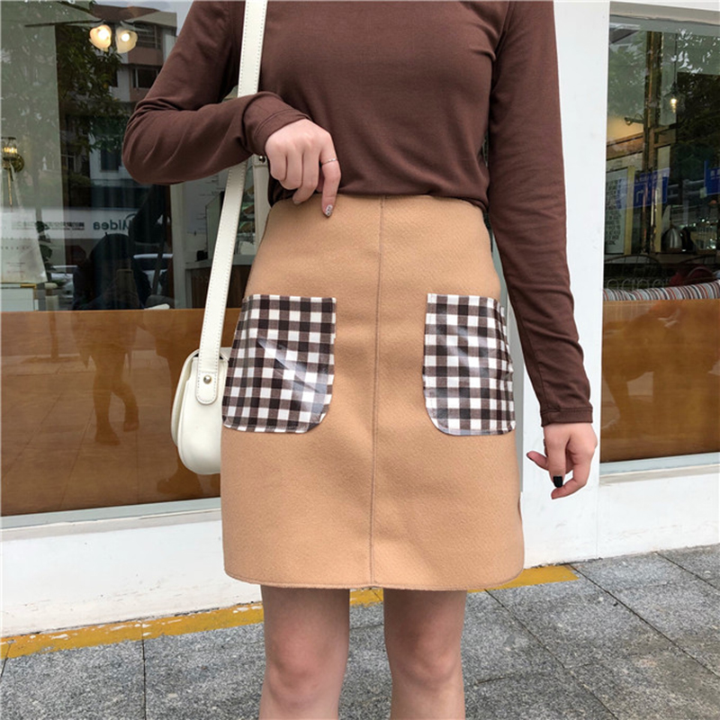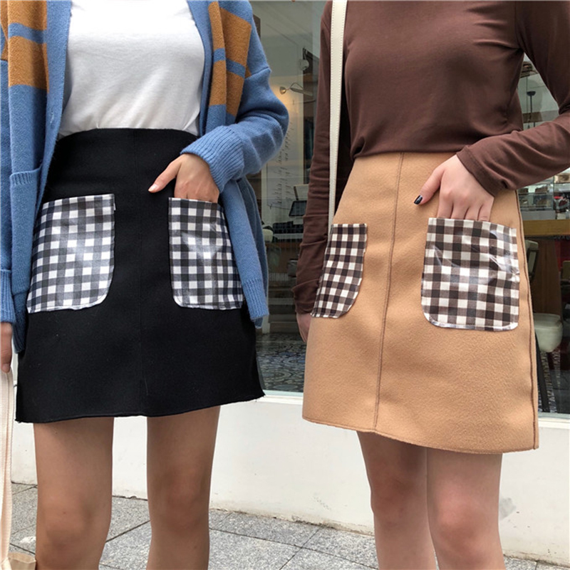 拼接格子口袋毛呢A字裙女秋冬裝2018新款韓版高腰顯瘦半身短裙子