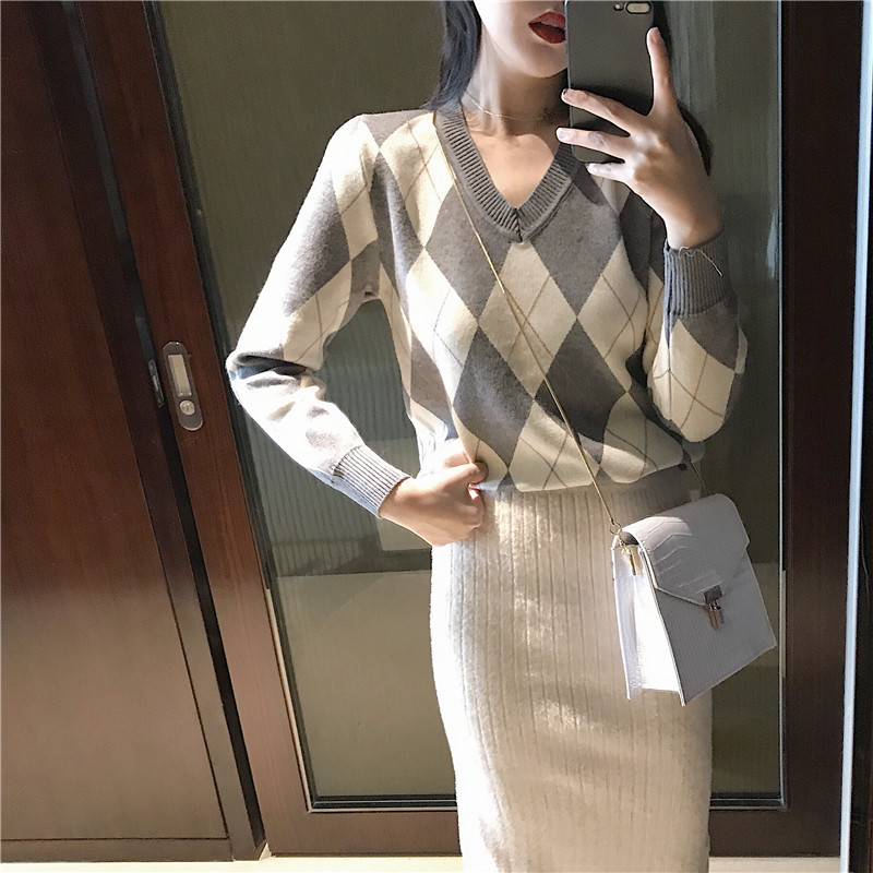 / 韓版秋裝女2018新款套裝菱形格子V領毛衣+高腰顯瘦針織開叉半身裙