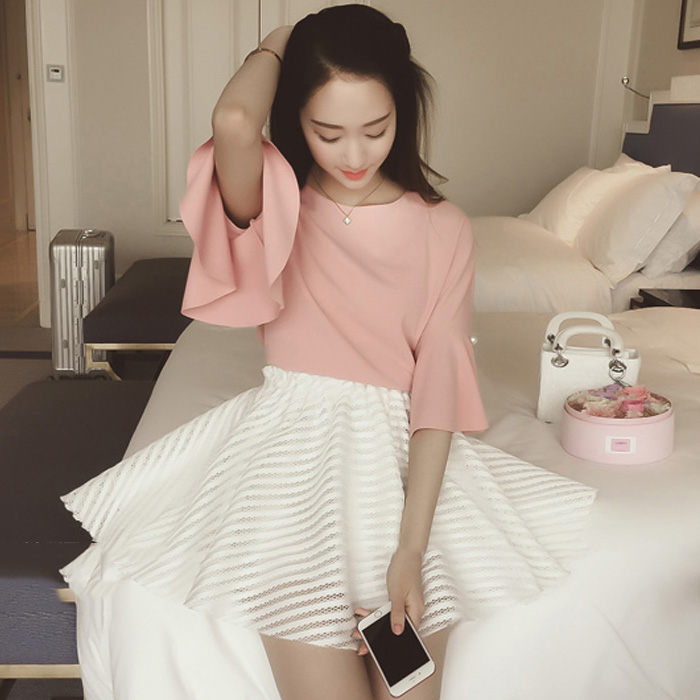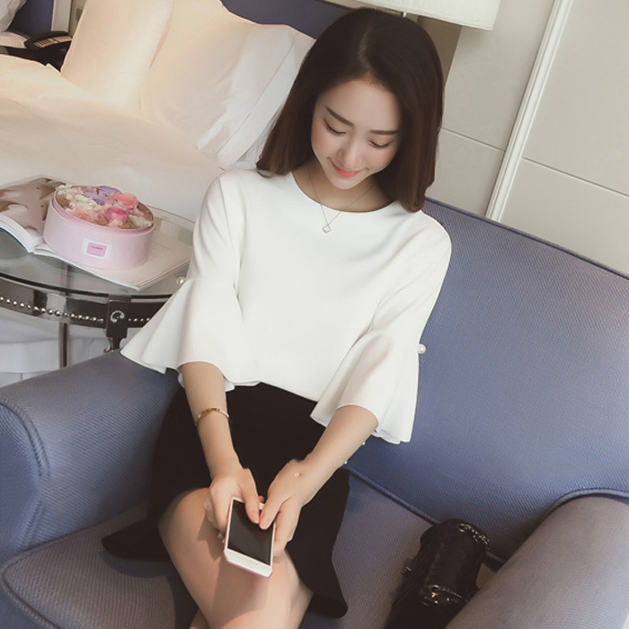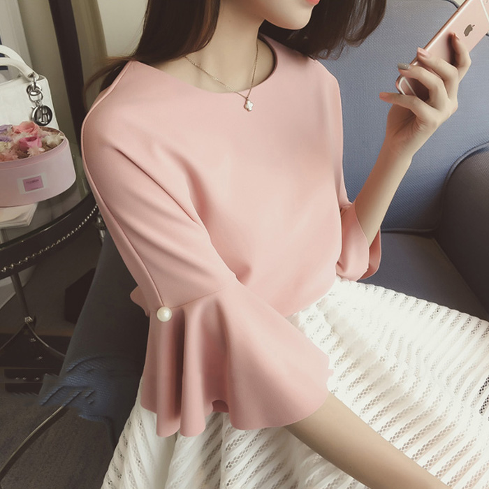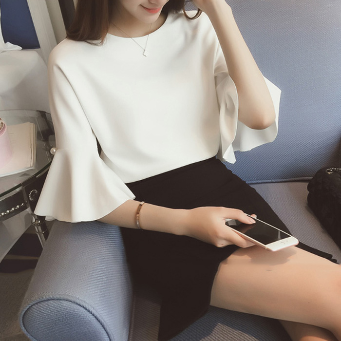 / 2016春夏裝新款韓系名媛氣質百搭純色短款五分喇叭袖雪紡衫女上衣