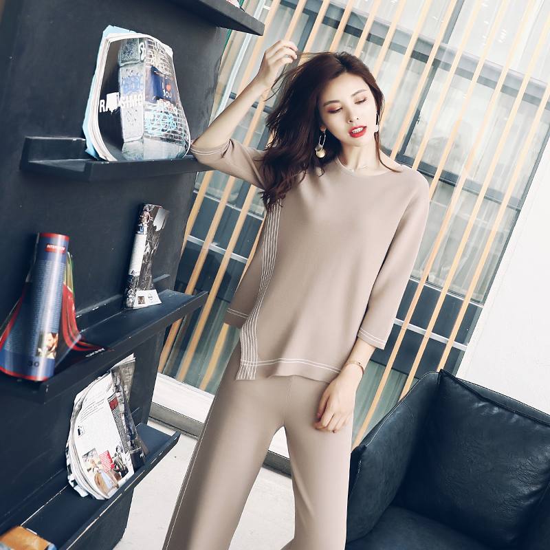 S秀2018夏季新款女時尚氣質兩件套圓領個性上衣闊腿褲針織套裝