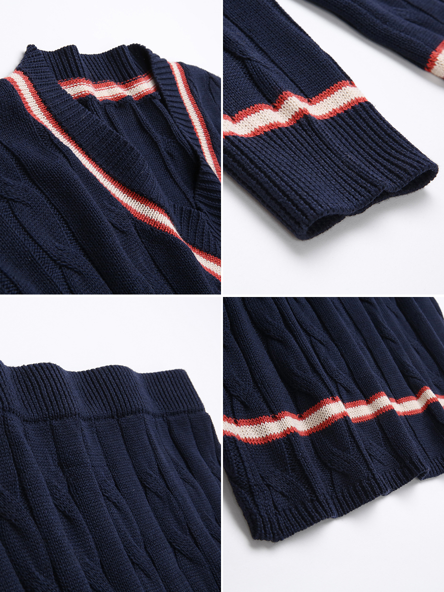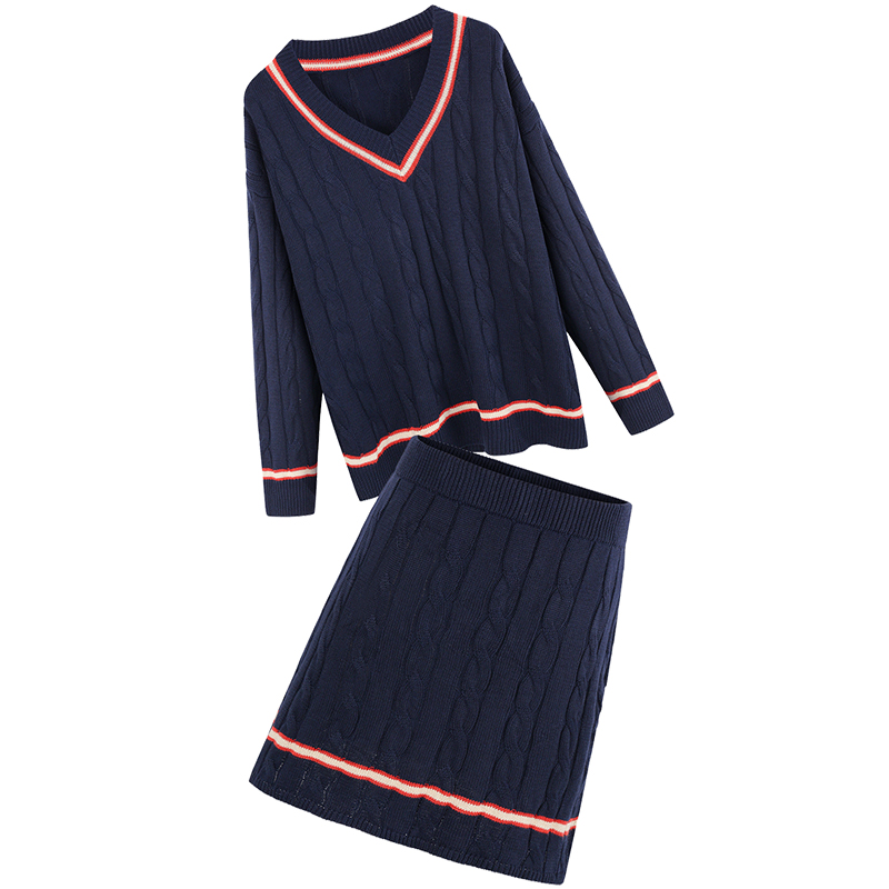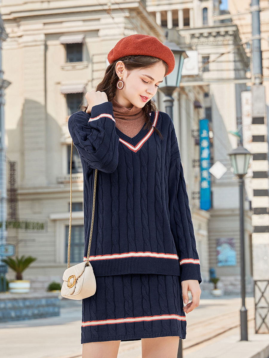 MG小象v領毛衣女秋冬新款高腰條紋半身裙學院風寬松休閑針織衫潮
