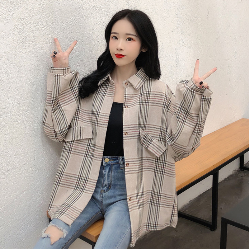 / 復古格子翻領襯衫女冬裝2018新款韓版中長款寬松燈籠長袖上衣外套