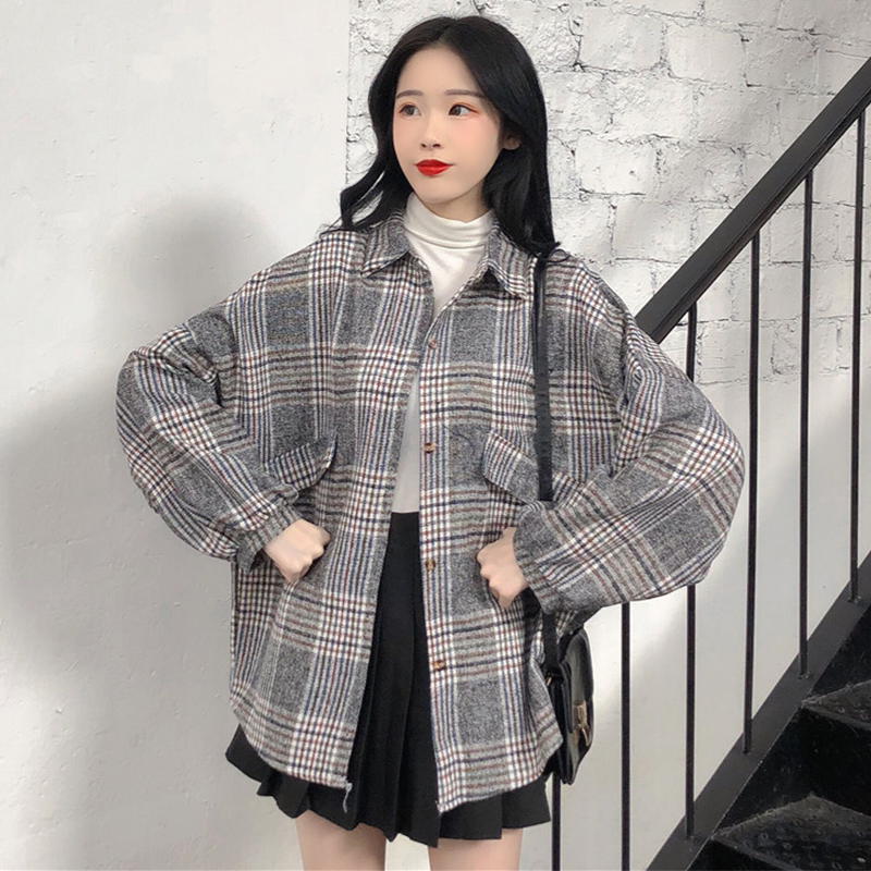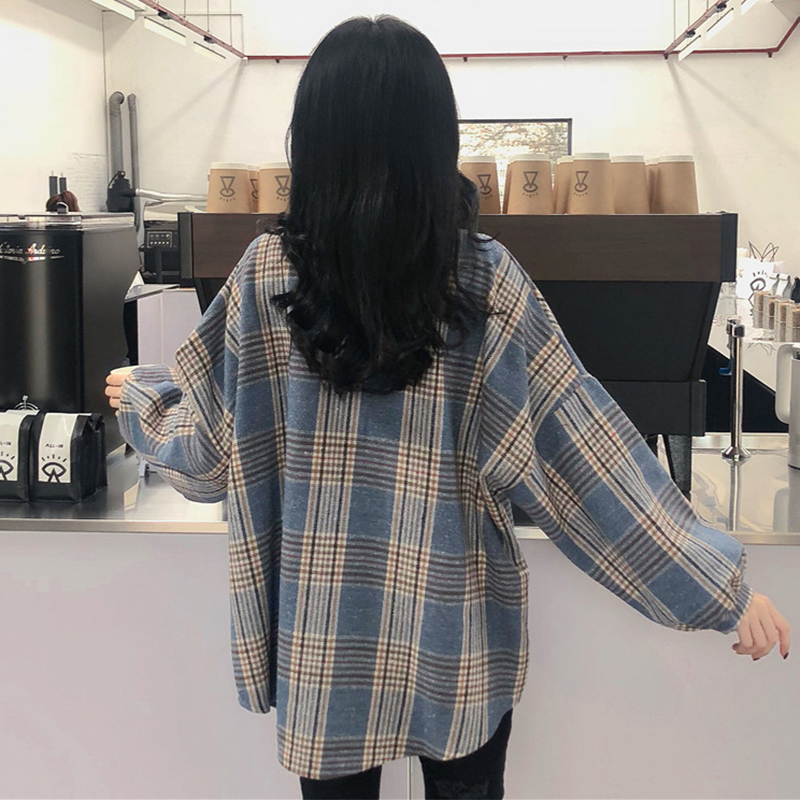 復古格子翻領襯衫女冬裝2018新款韓版中長款寬松燈籠長袖上衣外套