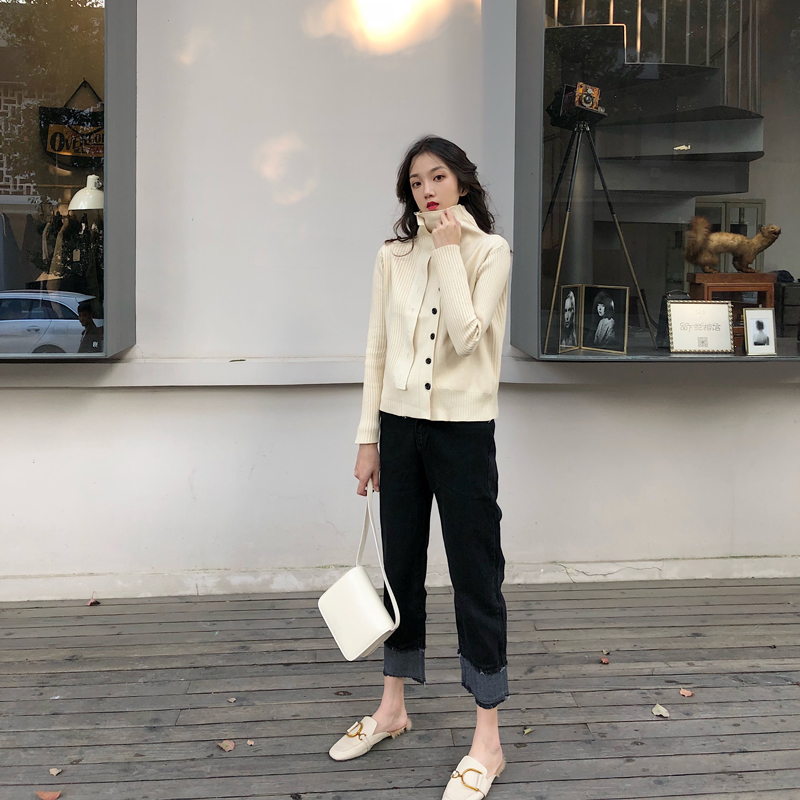 新款秋冬網紅款高領修身紐扣設計感針織衫直筒牛仔褲氣質時尚套裝