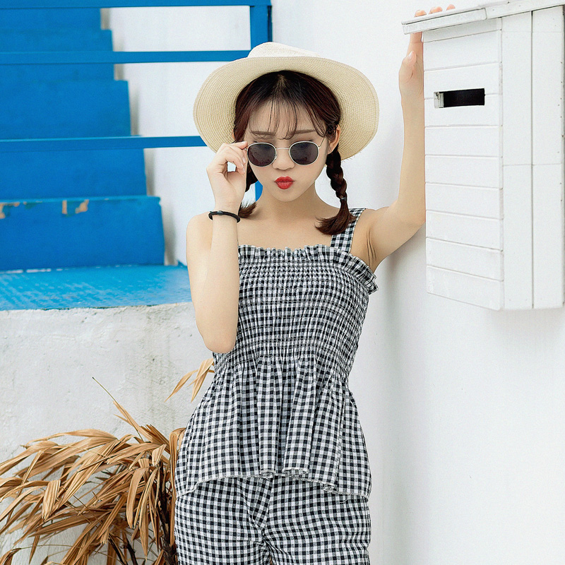 / 時尚套裝夏裝新款韓版女裝顯瘦格子吊帶高腰系帶闊腿褲兩件套