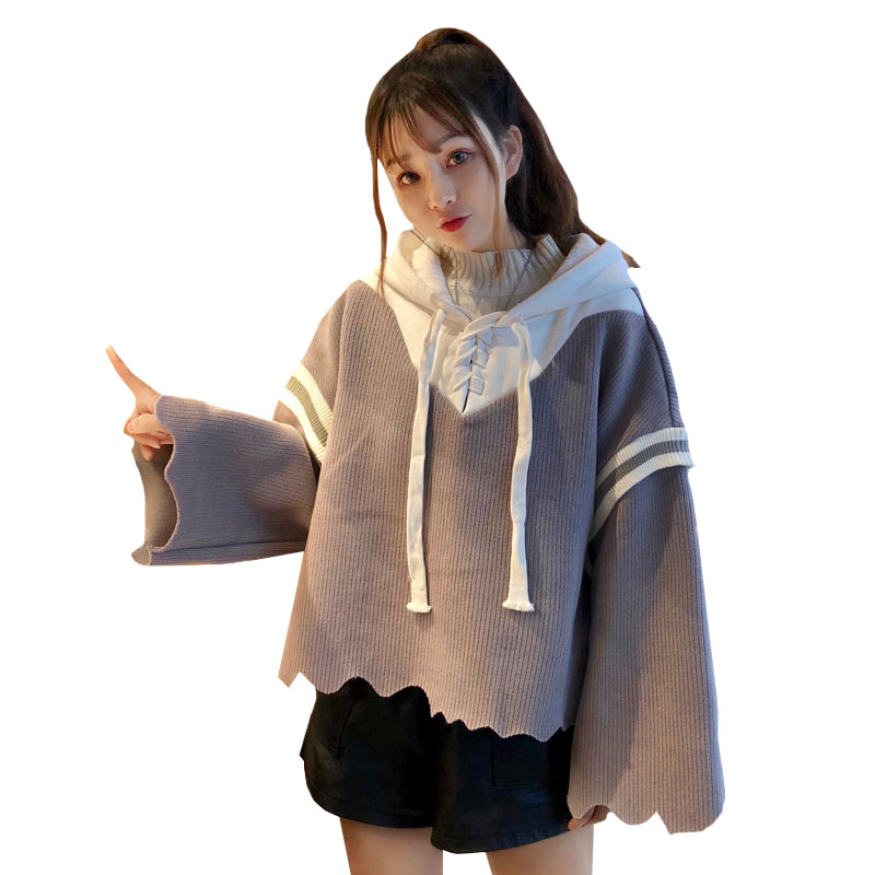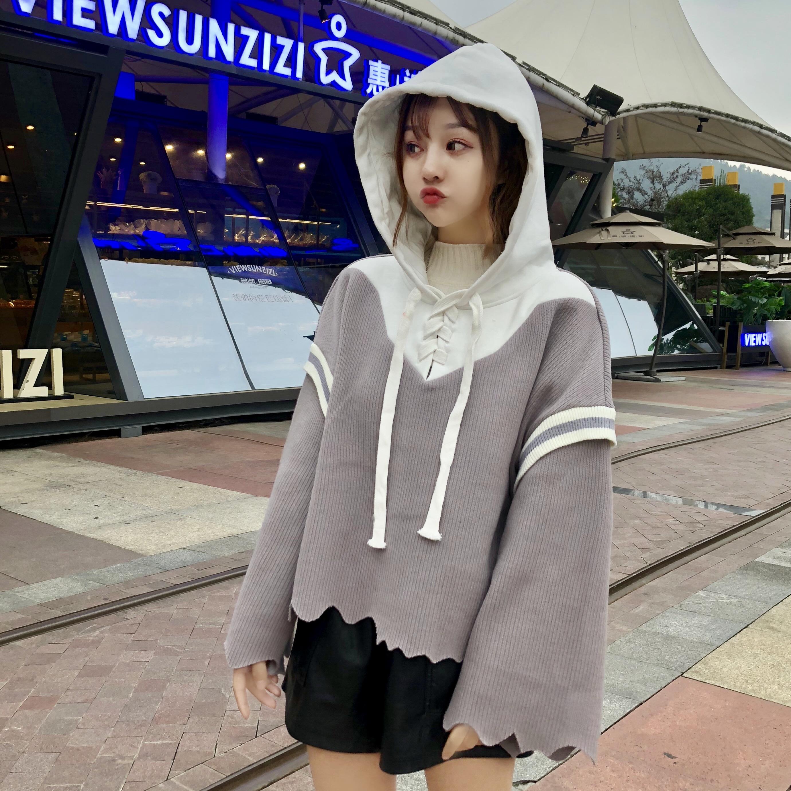 / 2018新款秋冬韓版學院風寬松拼接撞色綁帶連帽套頭超火衛衣外套女