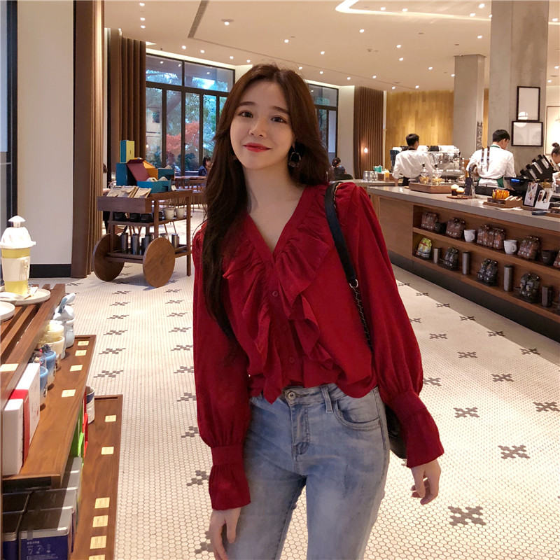 chic早秋上衣V領荷葉邊酒紅色長袖襯衫+高腰垂感拖地休閑直筒長褲