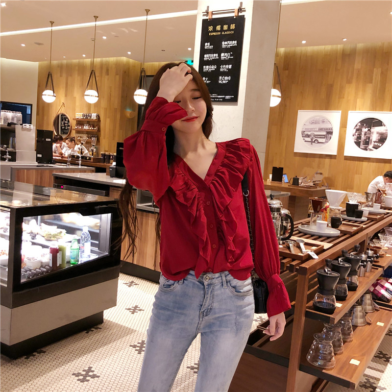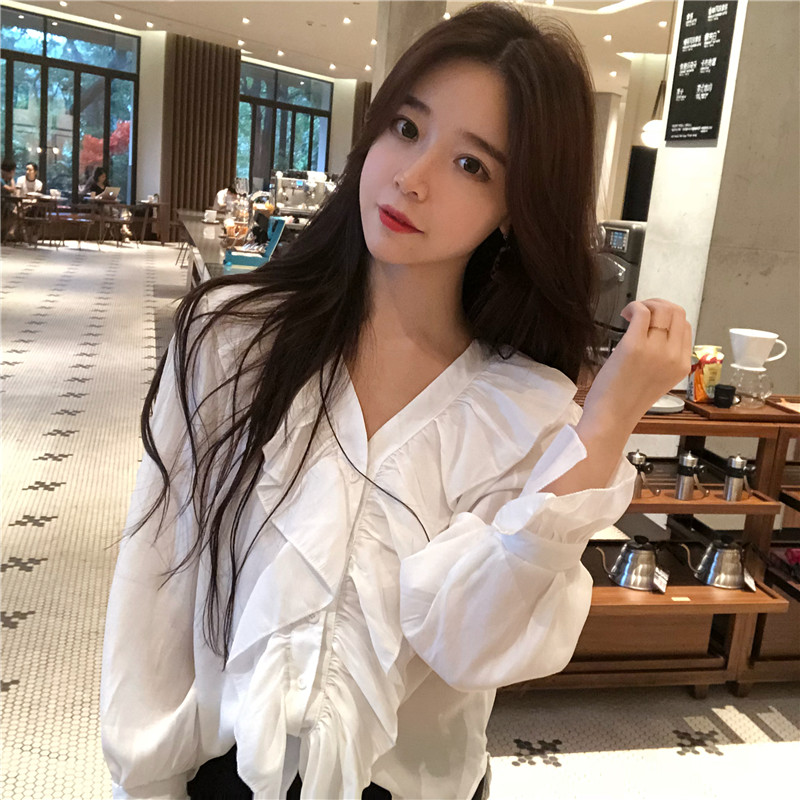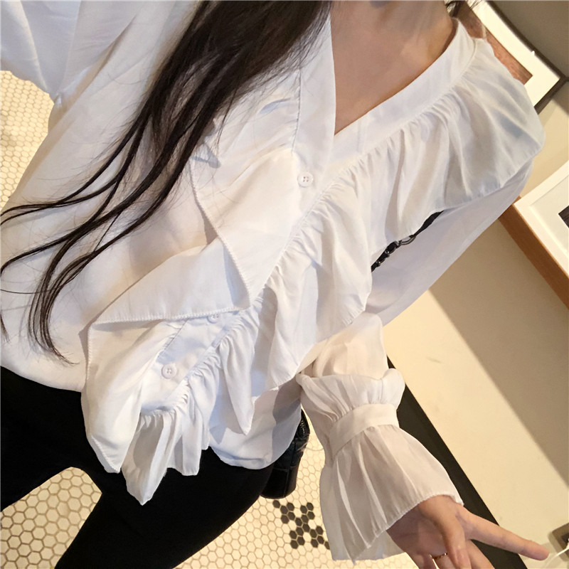 / 韓版女裝秋2018新款女簡約純色荷葉邊V領寬松喇叭袖排扣顯瘦襯衫