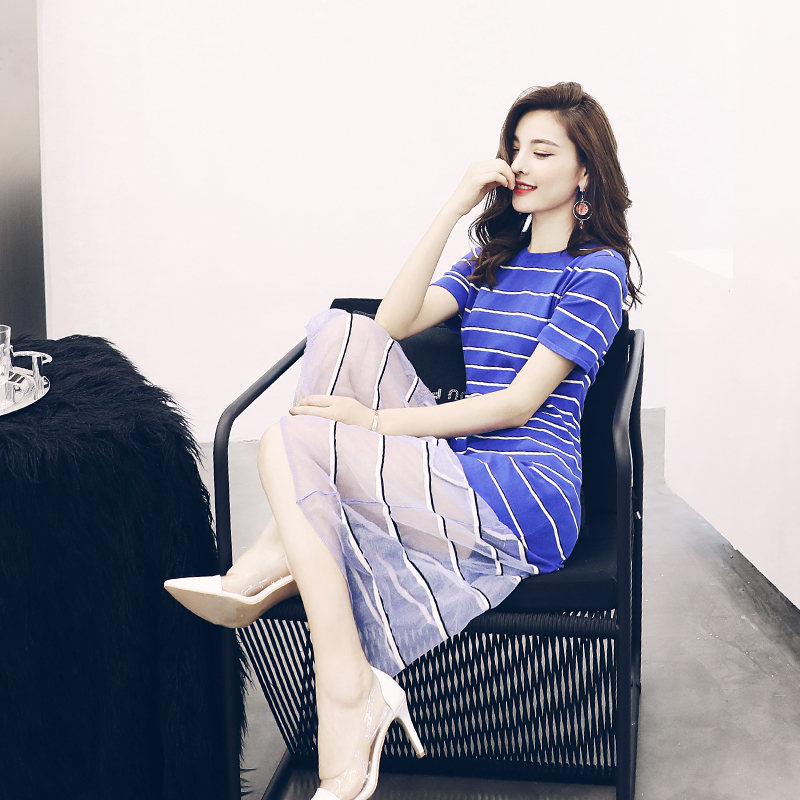 / 名媛慵懶風裙子夏女2018新款氣質極簡主義條紋拼接針織連衣裙
