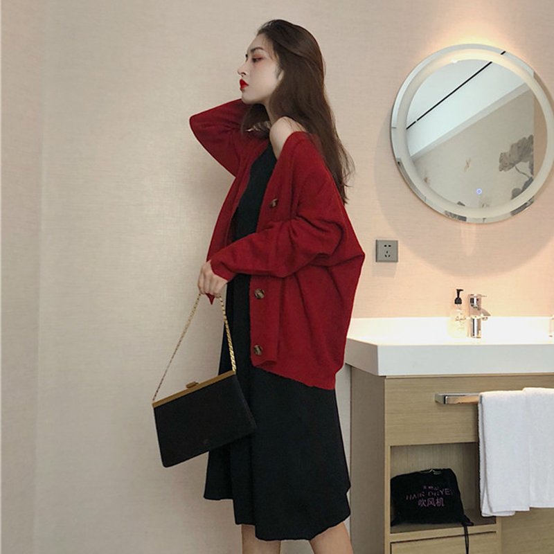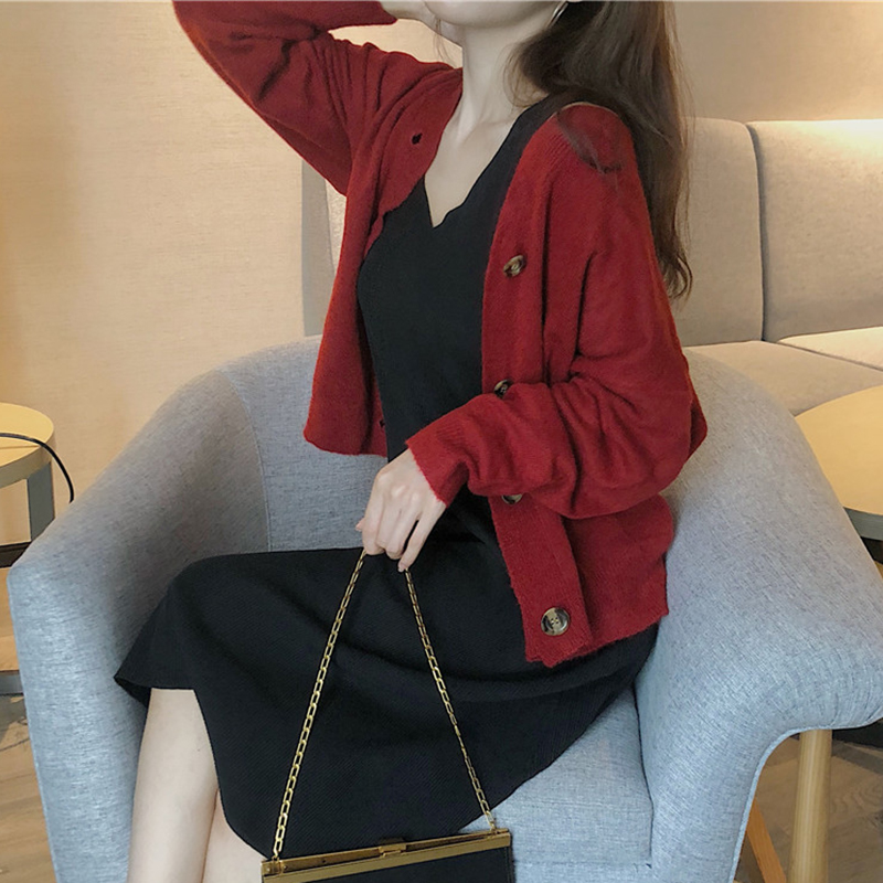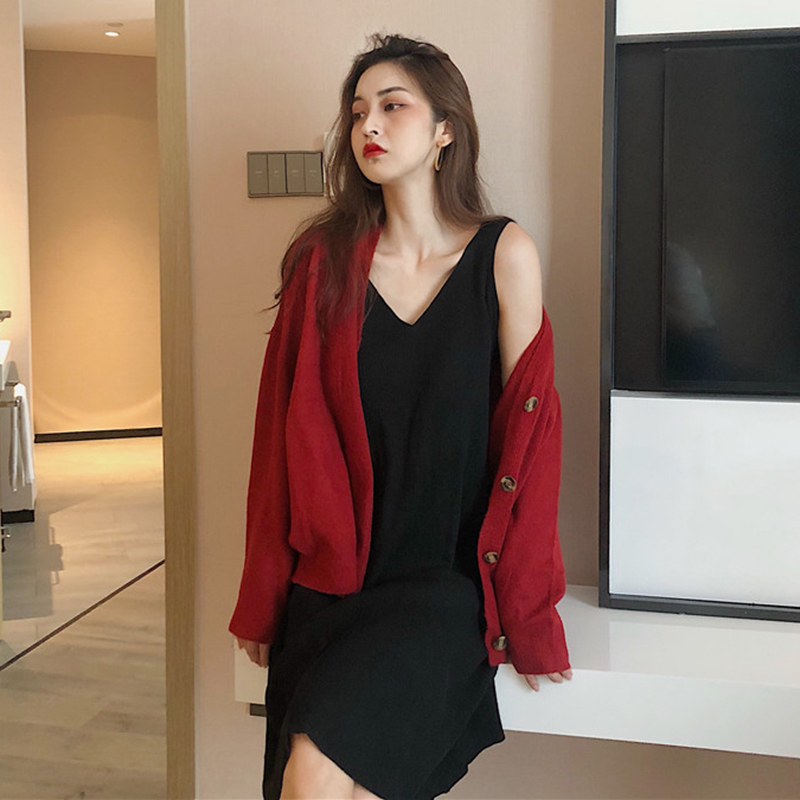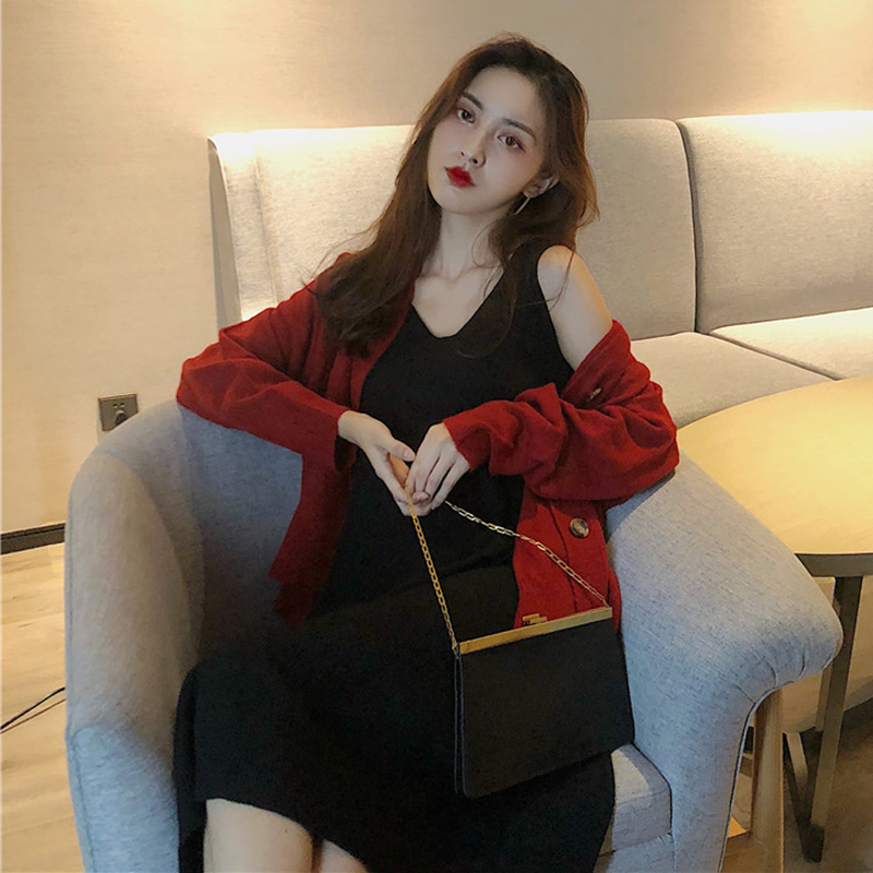 / 兩件套裝女秋新款V領黑色針織背心連衣裙子寬松長袖慵懶毛衣開衫
