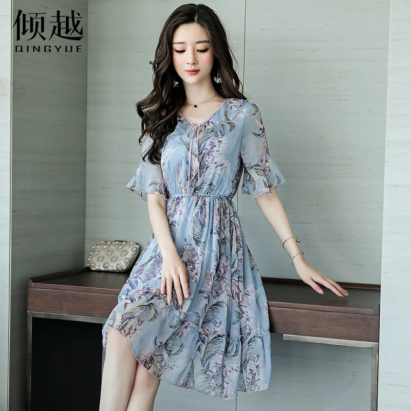 2017碎花雪紡連衣裙女夏裝新款氣質韓國v領喇叭袖荷葉邊裙子顯瘦