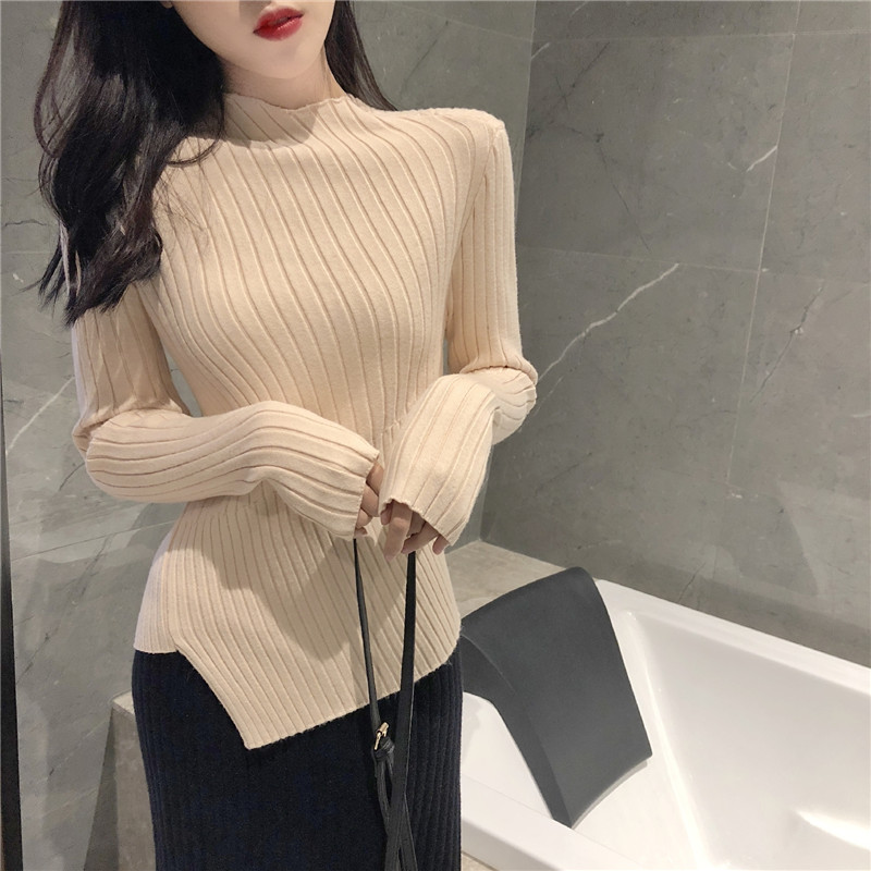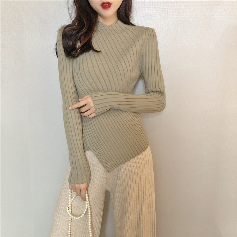 / chic秋冬毛衣女慵懶風韓版修身顯瘦不規則坑條針織衫女純色打底衫