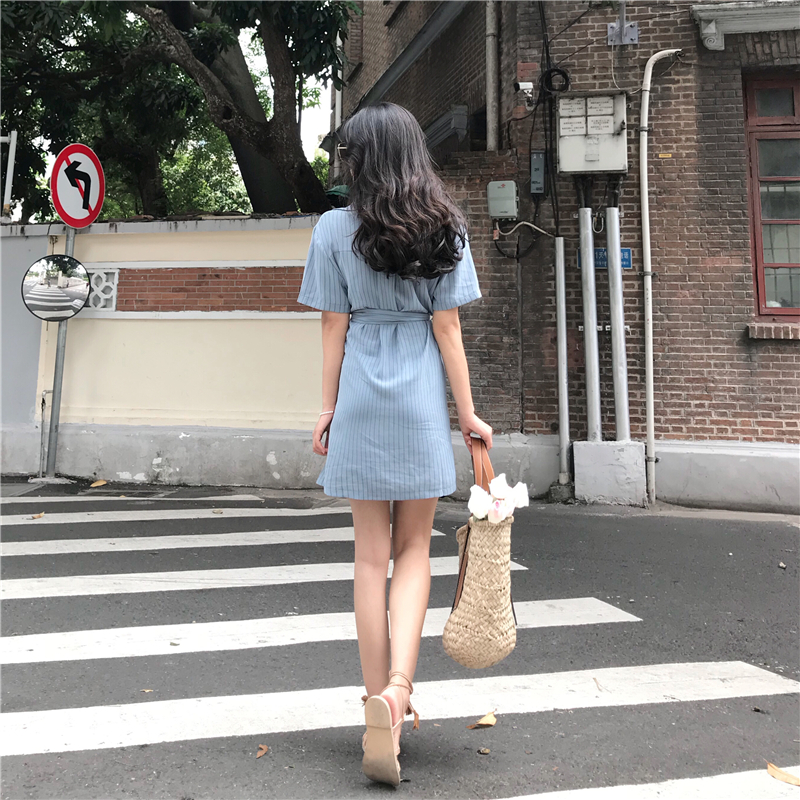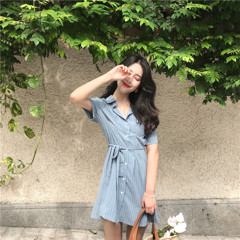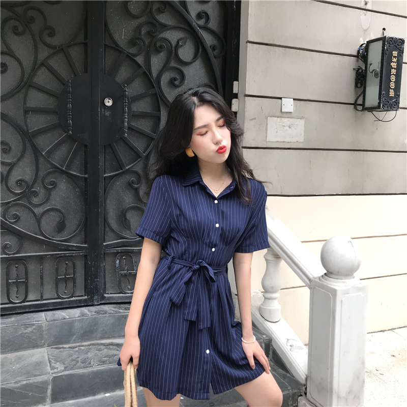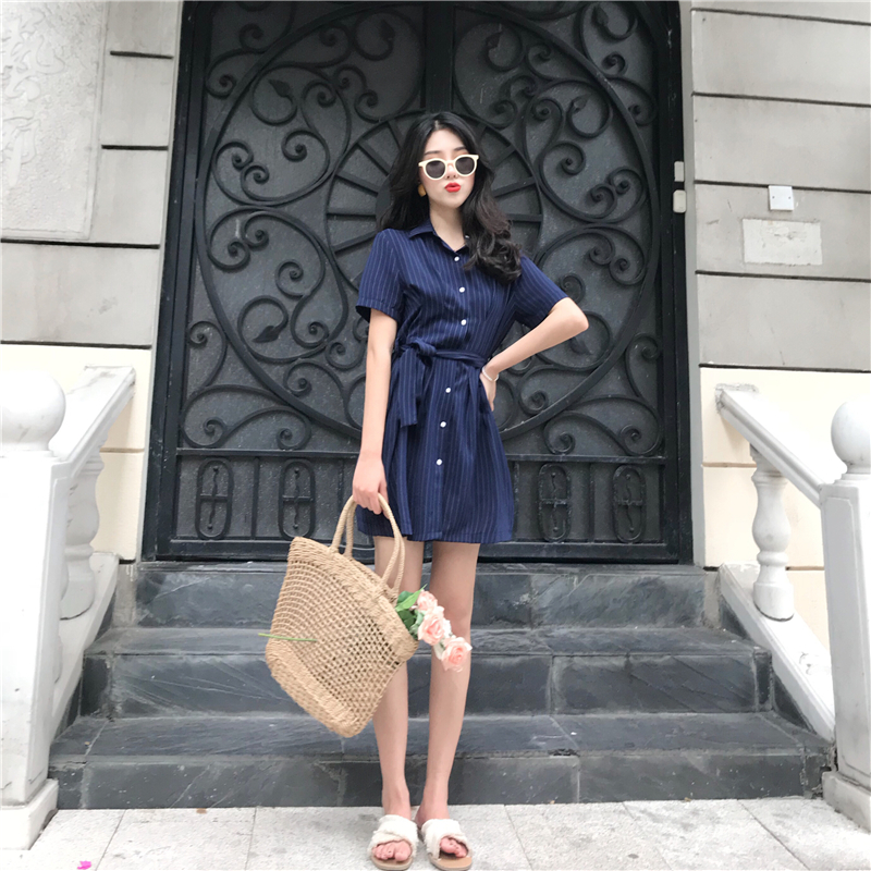 2018新款時尚百搭氣質顯瘦收腰POLO領短袖小心機條紋連衣裙襯衫裙
