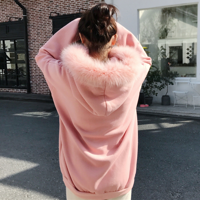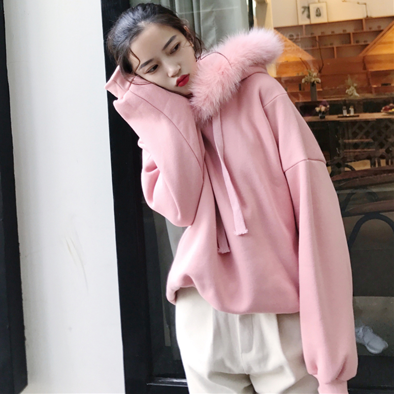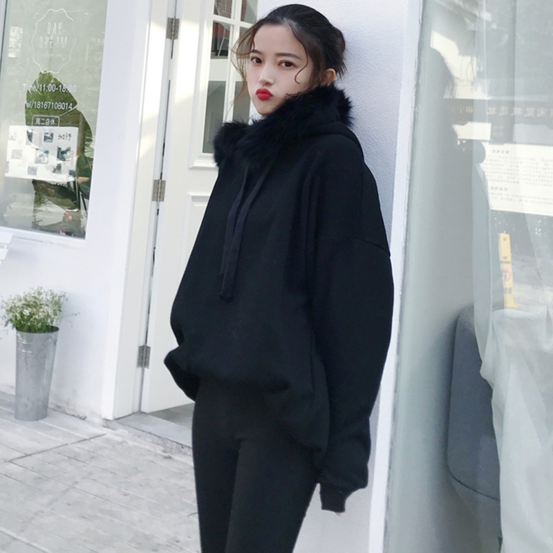/ 黑色加絨毛毛連帽衛衣秋冬2018新款女裝韓版學生寬松外套長袖上衣