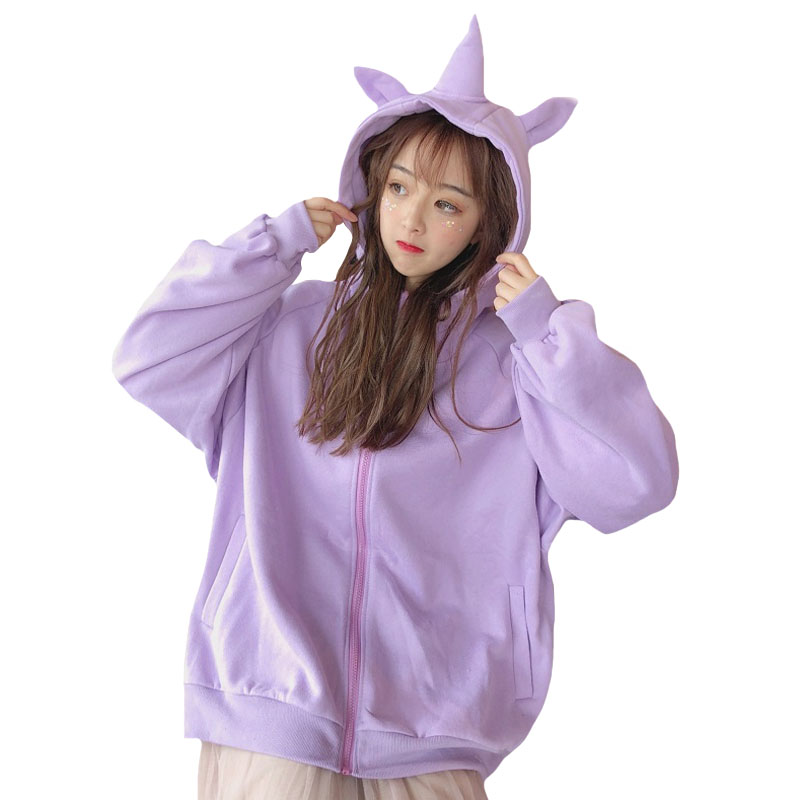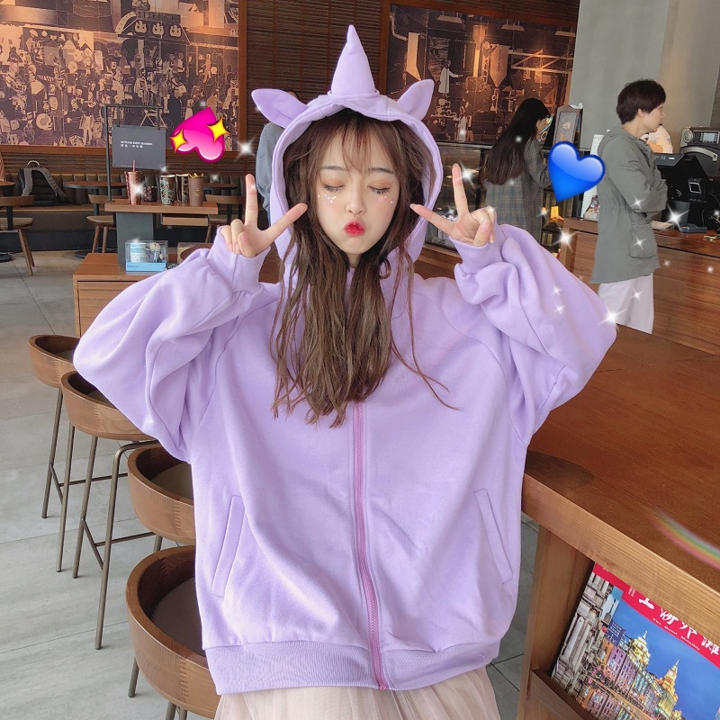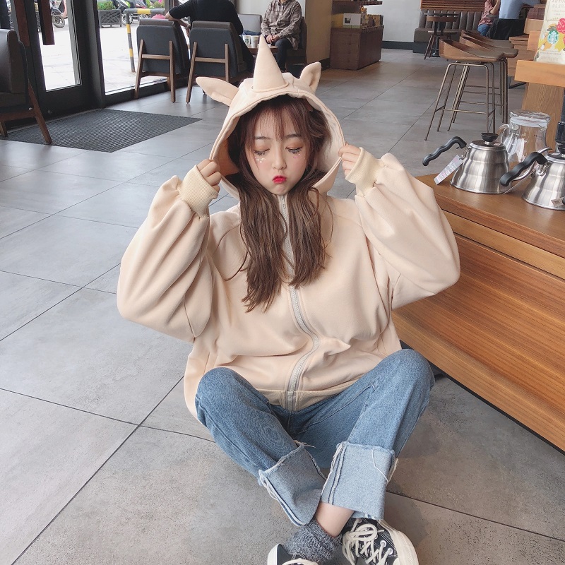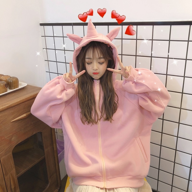 / 2018新款秋冬韓版寬松慵懶風可愛恐龍連帽加絨加厚開衫衛衣外套女