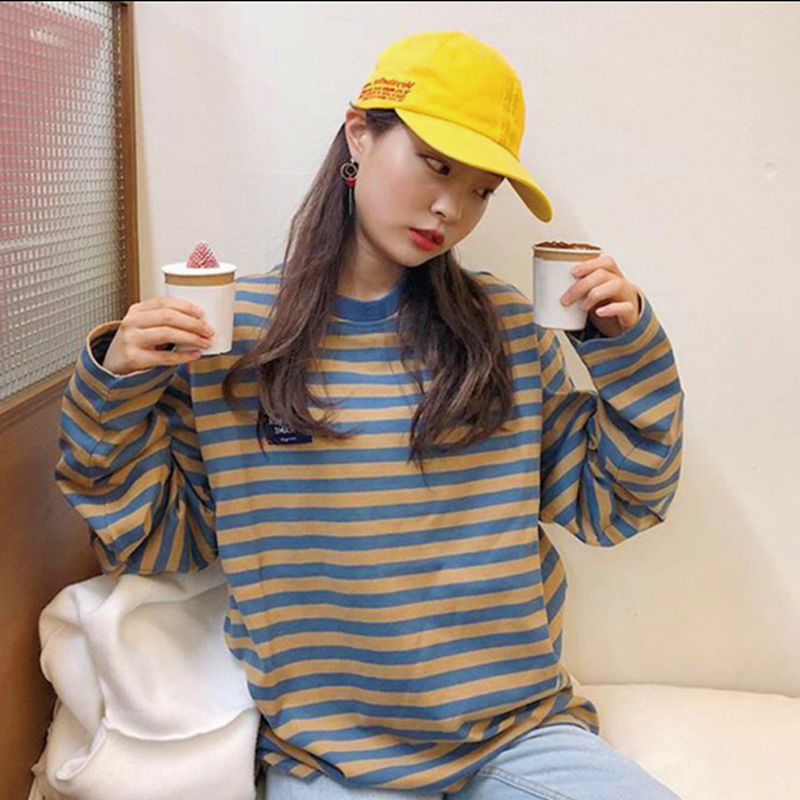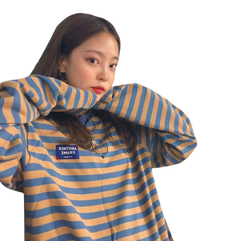 / 秋季女裝韓版中長款復古學院風寬松條紋字母長袖顯瘦T恤上衣學生