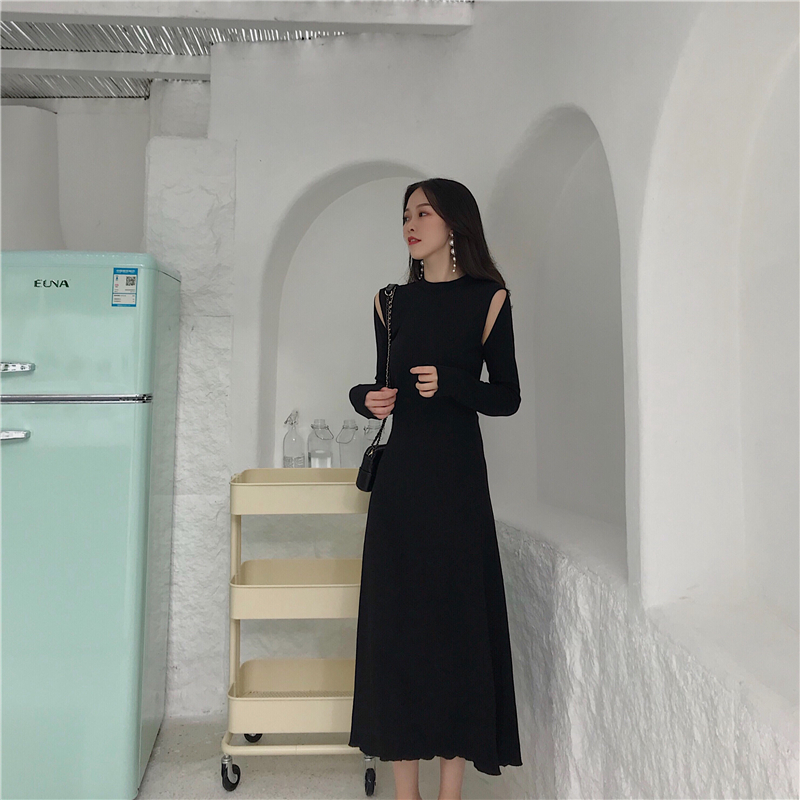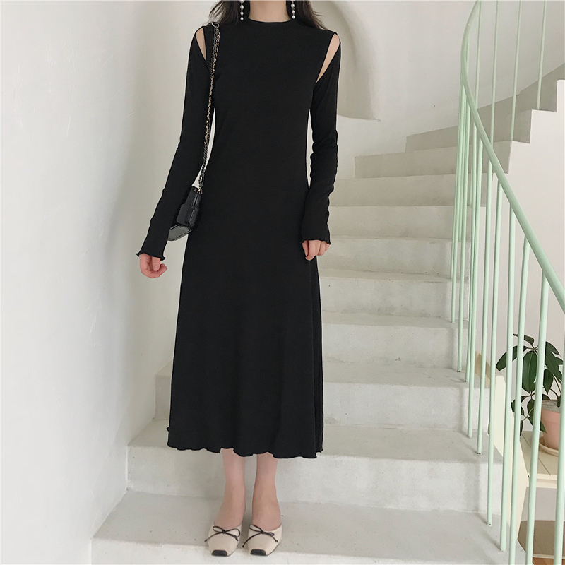 / chic早秋裙子長裙女慵懶風港味復古氣質內搭挖肩設計木耳邊連衣裙