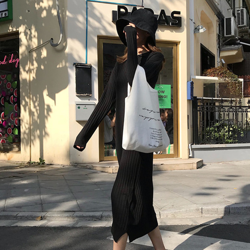 / 打底針織裙秋裝女新款氣質修身顯瘦坑條長袖連衣裙時尚翻領長裙子