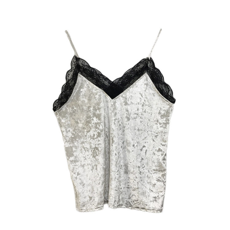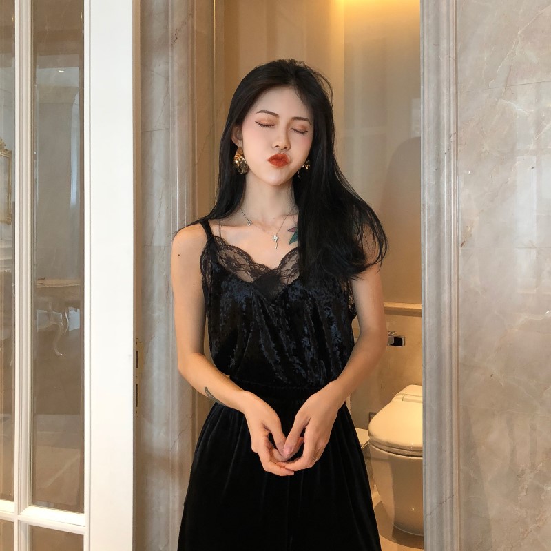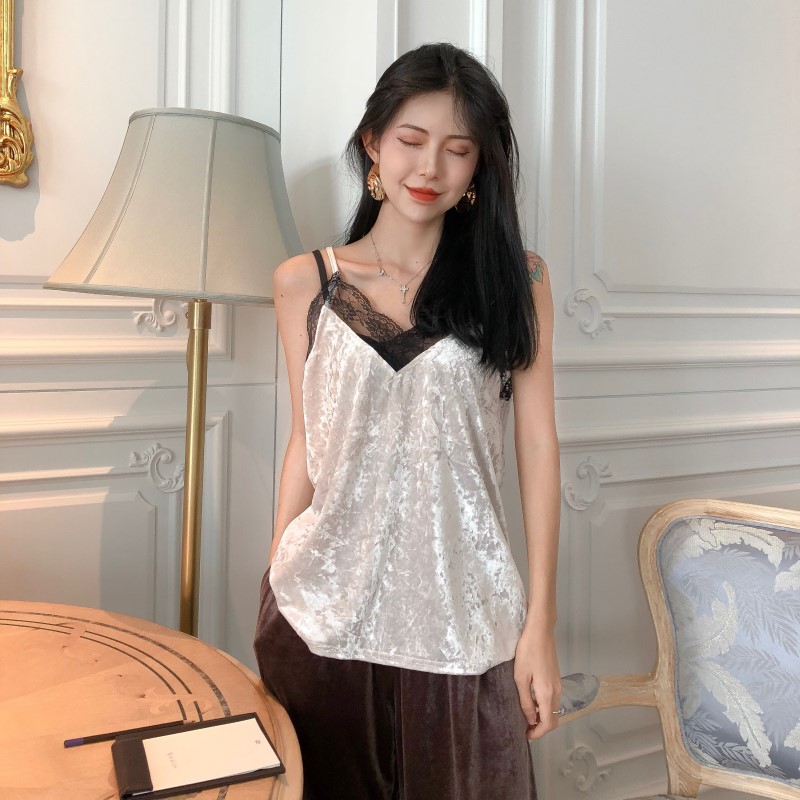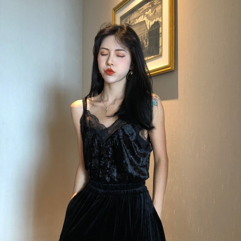 / 時尚港味復古chic吊帶韓版氣質百搭V領蕾絲花邊拼接絲絨吊帶背心