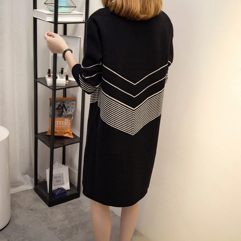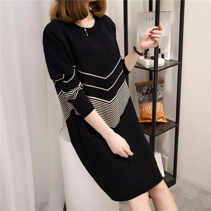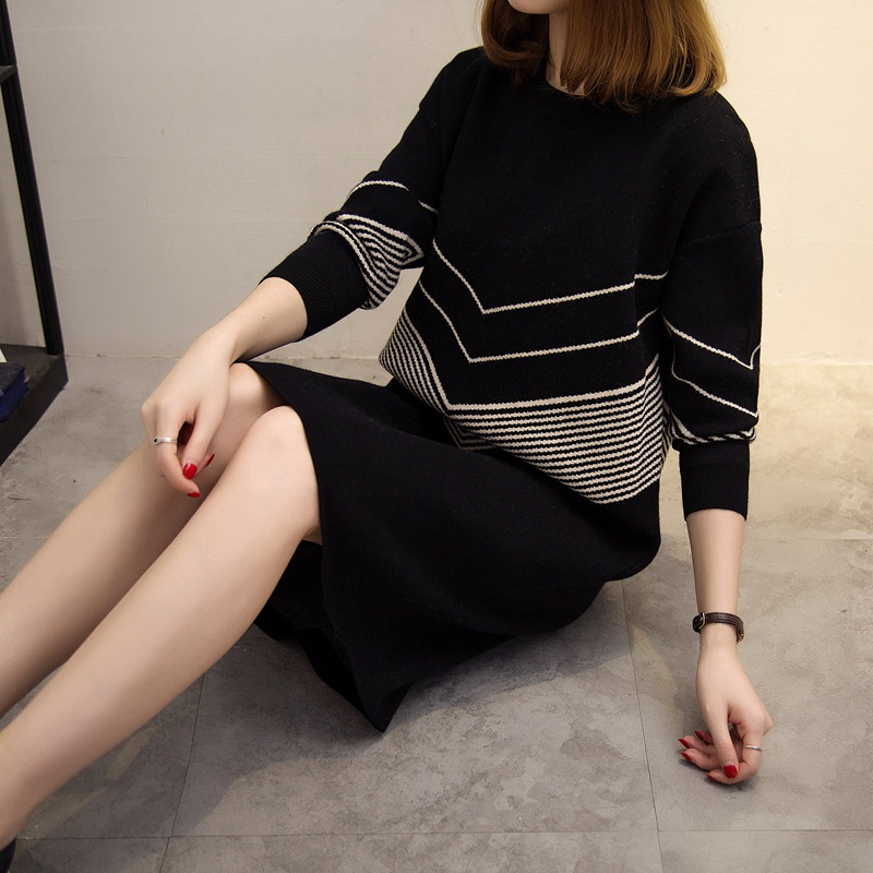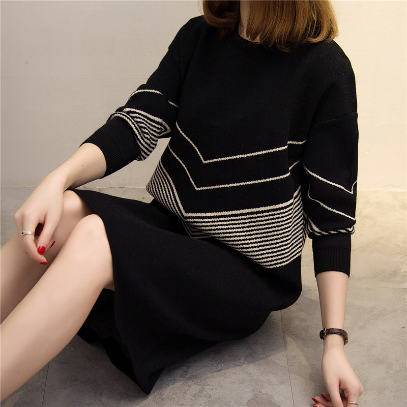 中長款毛衣女秋冬打底上衣長袖條紋針織衫套頭外套女裝新款潮