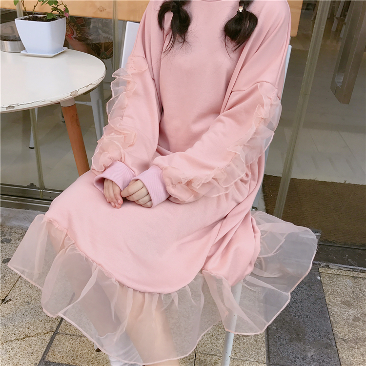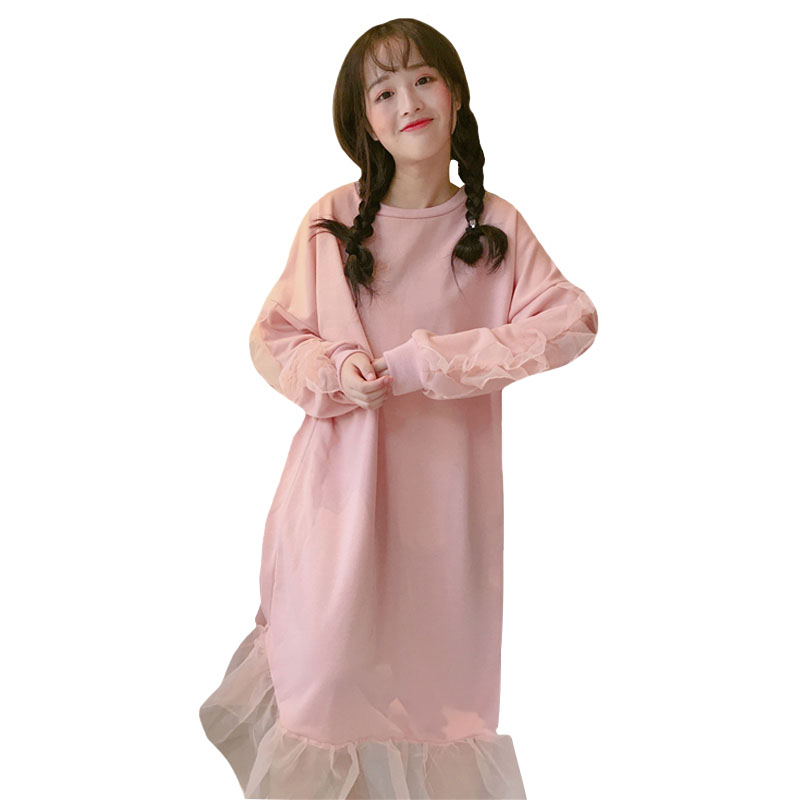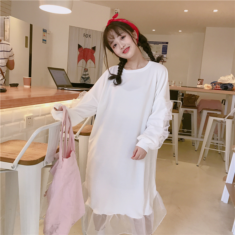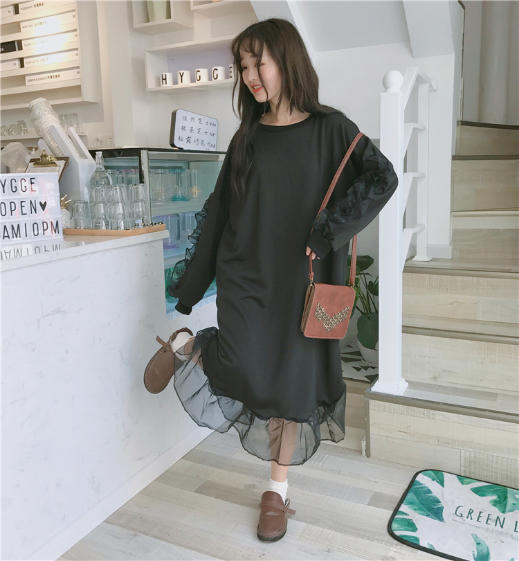 / 秋季韓版氣質純色中長款寬松網紗拼接荷葉邊長袖顯瘦連衣裙長裙女