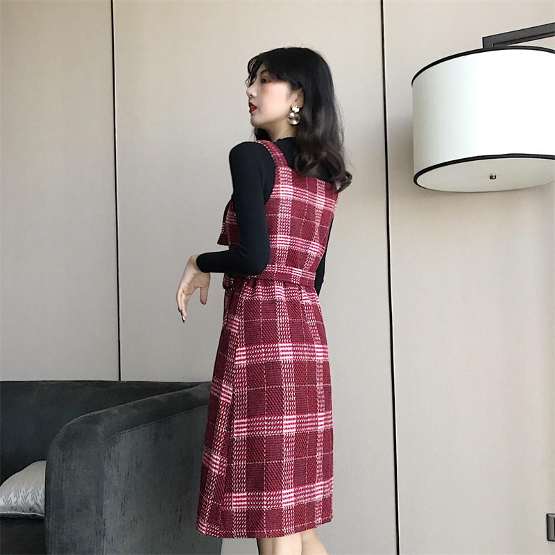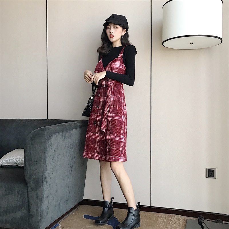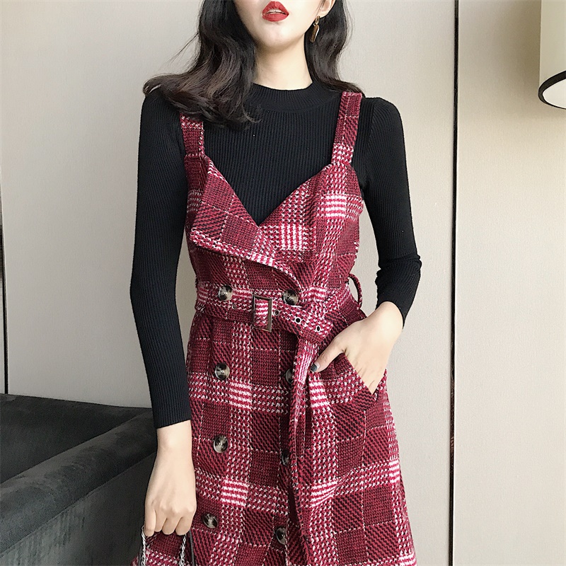 秋裝女新款溫柔風百搭款打底衫+紅色格子收腰背帶裙中長款連衣裙