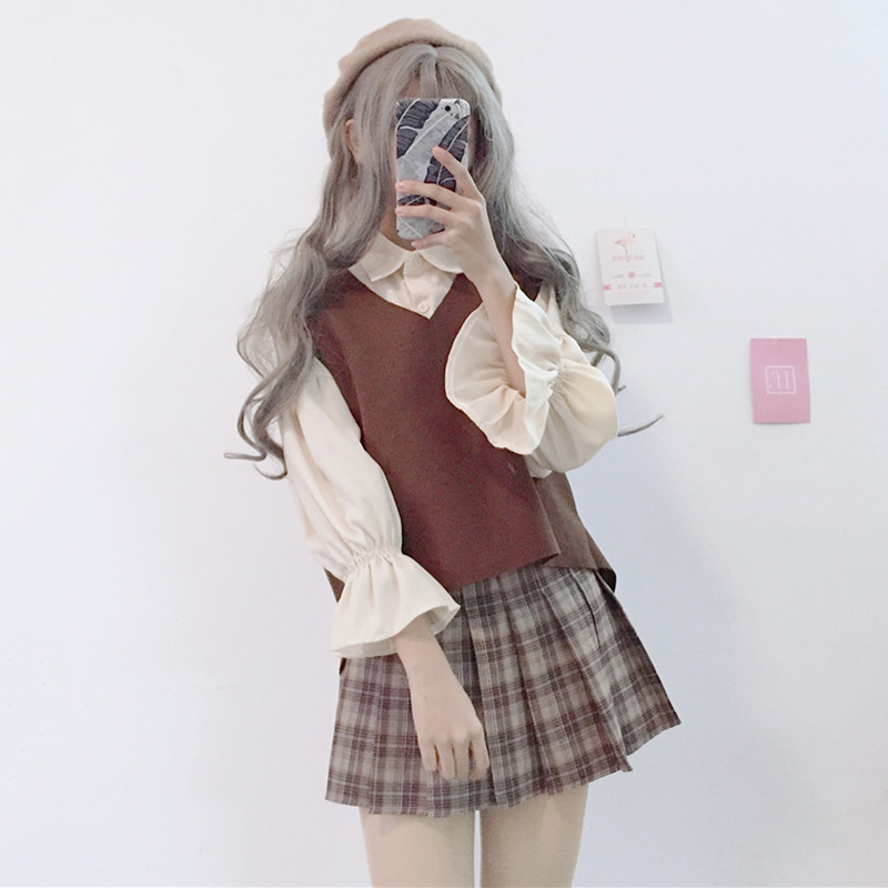 甜美學院風早秋兩件套女秋裝新款學生喇叭袖襯衣配馬甲開叉背心