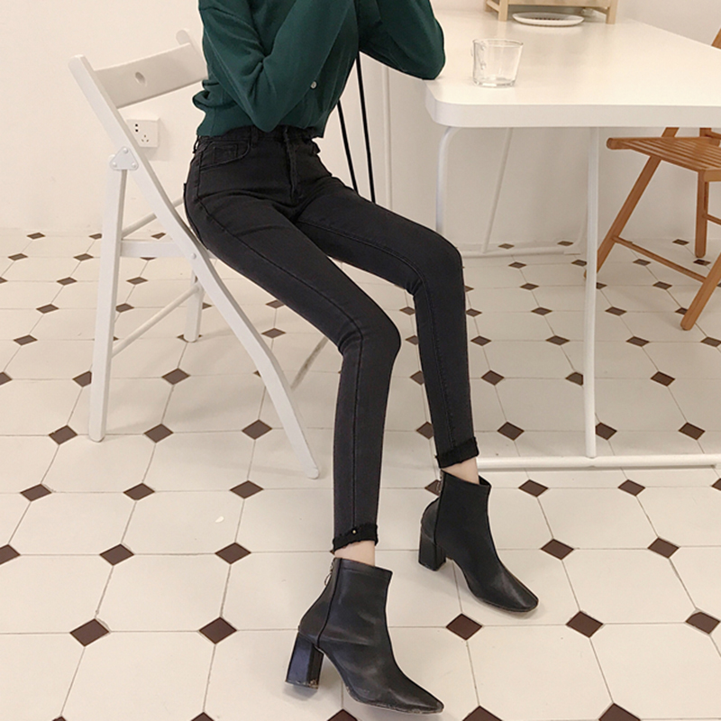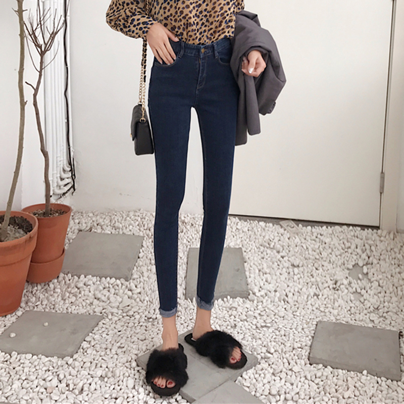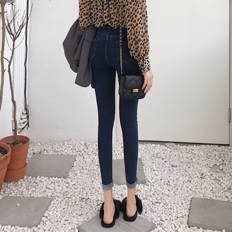 / 高腰顯瘦加絨緊身牛仔褲女秋冬裝新款學生復古風小腳卷邊鉛筆褲子