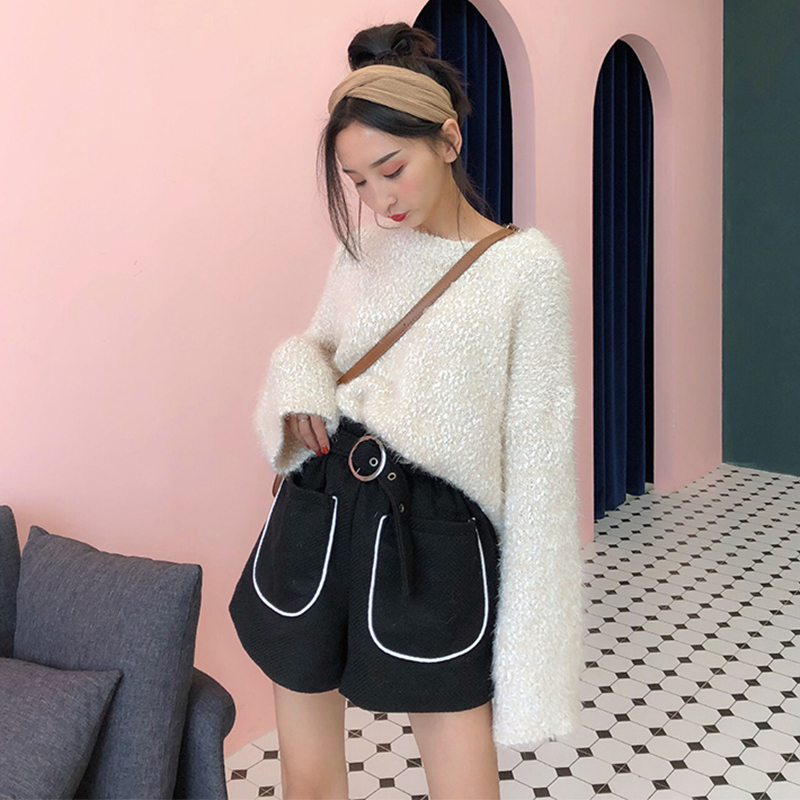 / chic風毛呢撞色闊腿褲女秋冬裝2018新款韓版高腰寬松顯瘦短靴褲子