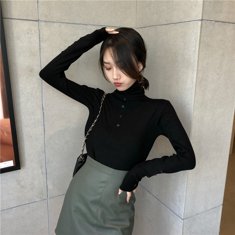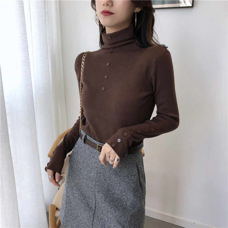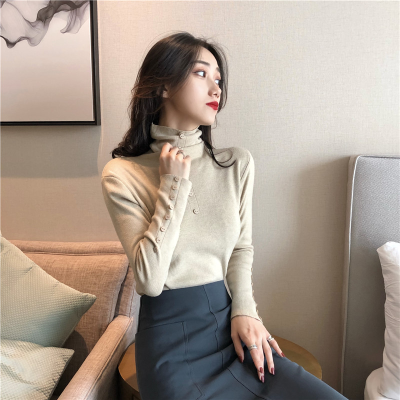 網紅同款2018新款秋慵懶風套頭毛衣女百搭高領紐扣裝飾長袖針織衫